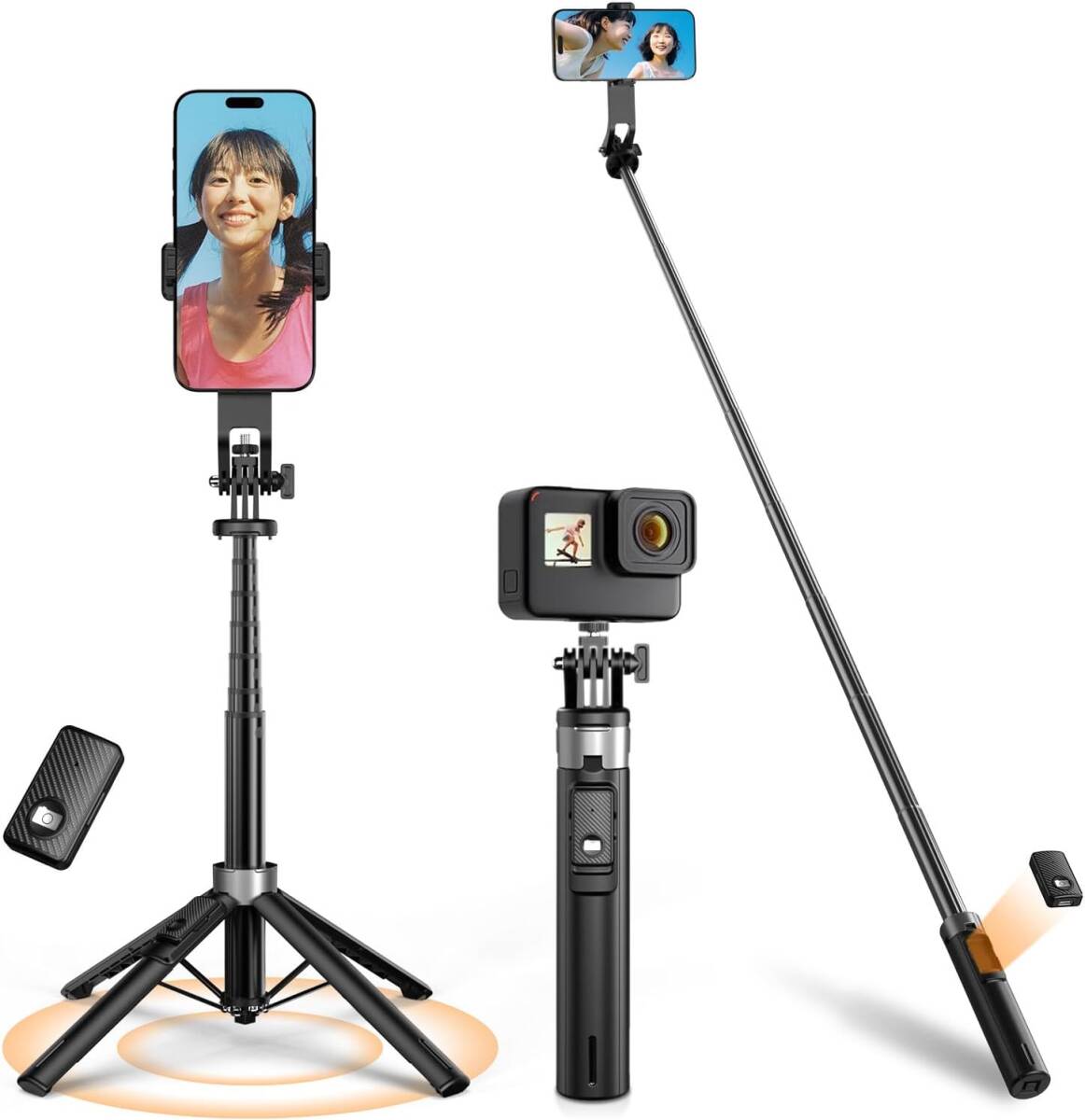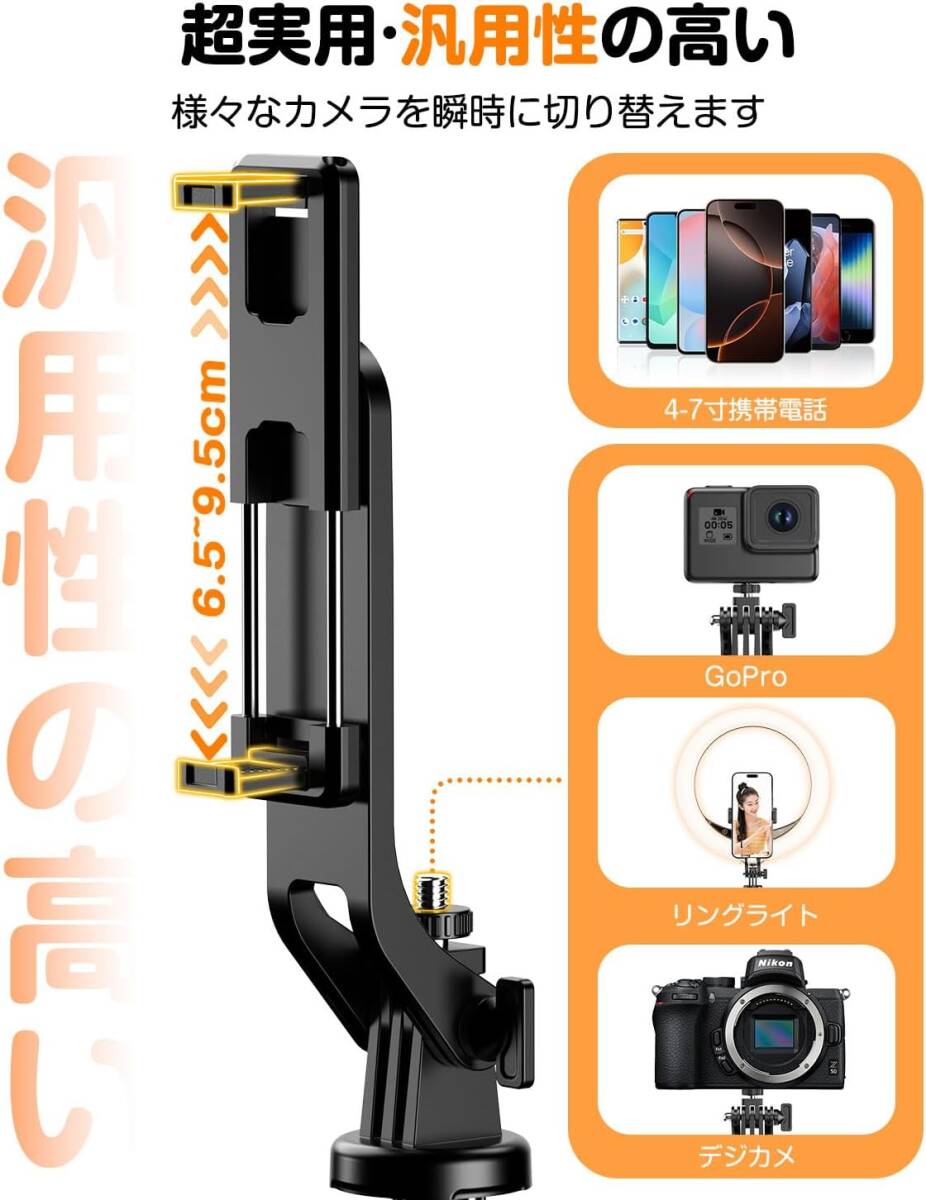 • 【汎用性の高いアクセサリーポート 様々な撮影デバイスに対応】 スマートフォン(4〜7インチ)、GoPro、補助ライトなど、様々なデバイスに対応可能なネジ口を装備。スマホホルダーは360°自由に回転でき、前後角度も270°まで調整可能です。これにより、どんなシーンでも完璧なアングルで撮影できます。