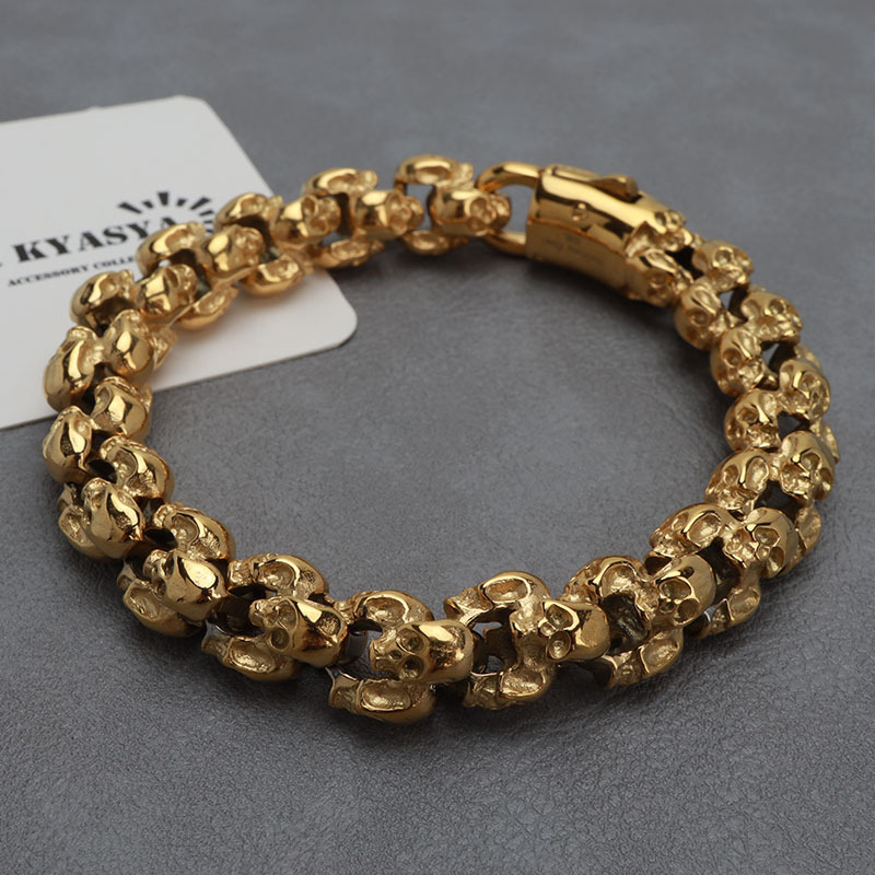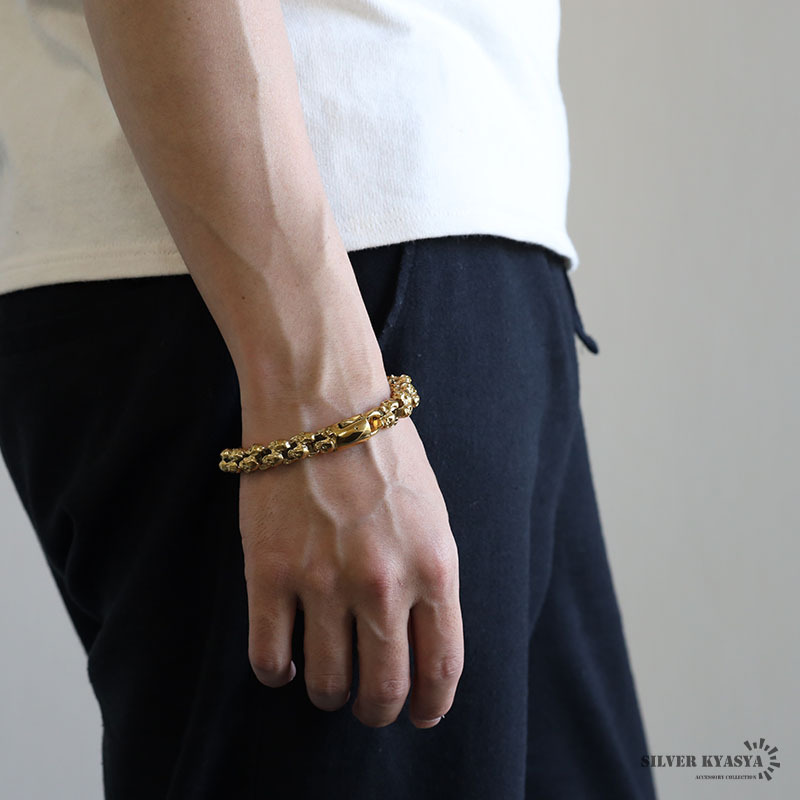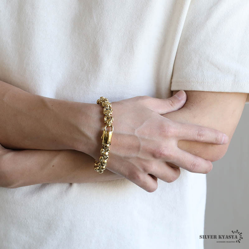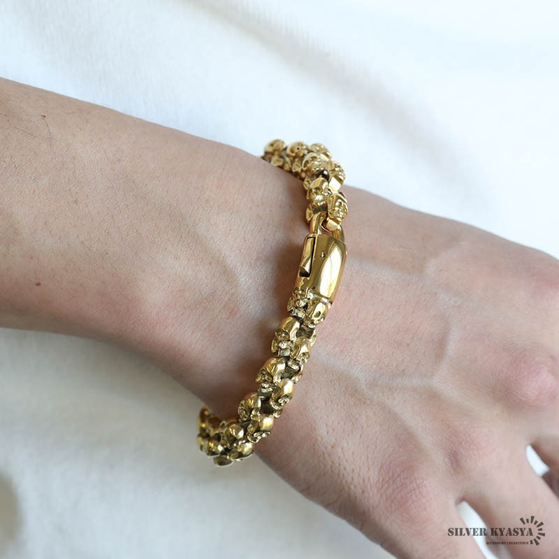 高級感のあるゴールドとスカルチェーンがマッチしたブレスレット。繊細に仕上げられたスカルチェーンが腕にズシリと絡みつき、目を惹くアイテム。