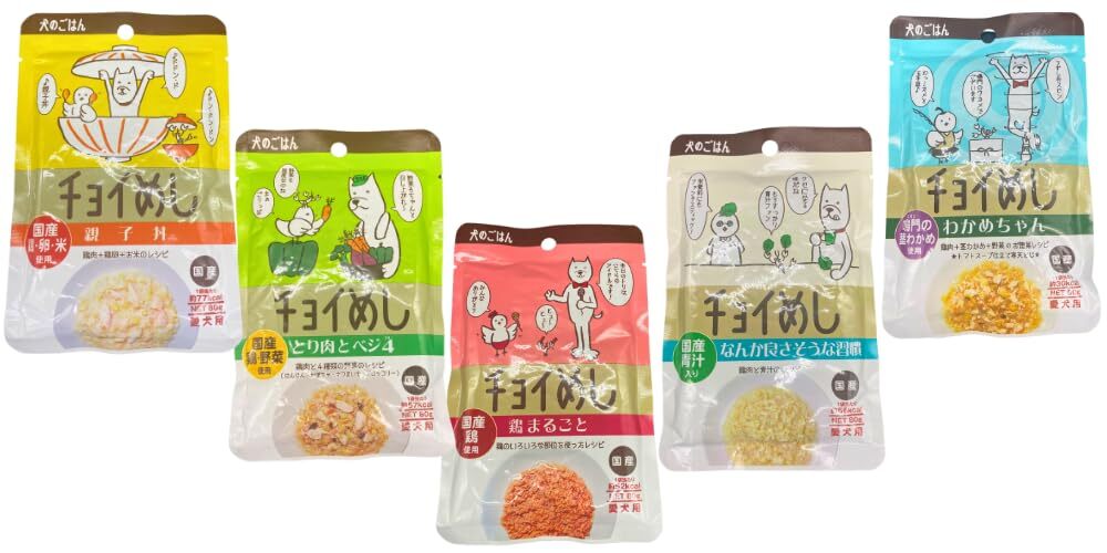 | 商品名 | 犬のごはん チョイめし 5種アソートセット【親子丼・とり肉とベジ4・鶏まるごと・なんか良さそうな習慣・わかめちゃん】各種1袋ずつ |