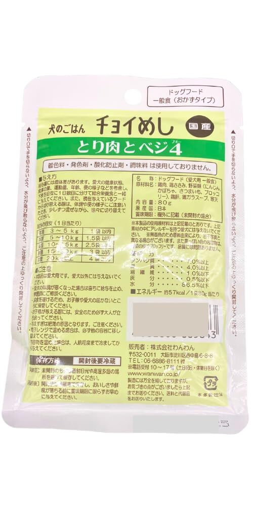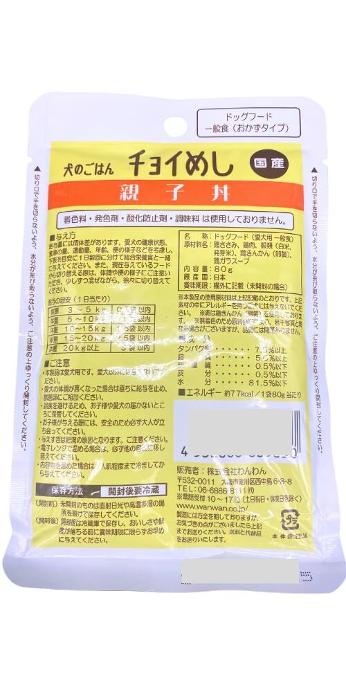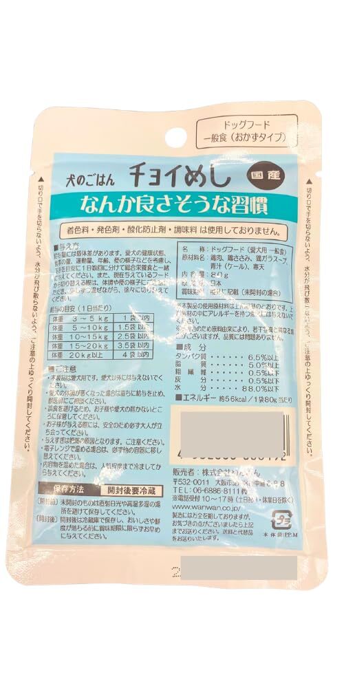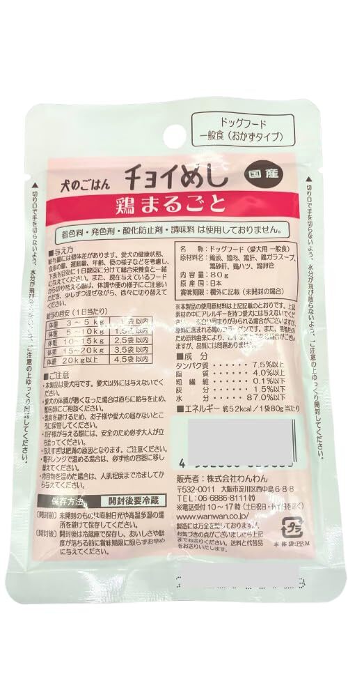 | 商品説明 | 親子丼(80g):鶏肉+鶏卵+お米のレシピ(国産の鶏・卵・米使用) とり肉とベジ4(80g):鶏肉と4種類の野菜(にんじん・かぼちゃ・さつまいも・ブロッコリー)のレシピ(国産の鶏・野菜使用) 鶏まるごと(80g):鶏のいろんな部位をつかったレシピ(国産の鶏使用) なんか良さそうな習慣(80g):鶏肉と青汁のレシピ(国産の青汁入り) わかめちゃん(80g):鶏肉+茎わかめ+野菜のお惣菜レシピ★トマトスープ仕立て寒天とじ★(鳴門の茎わかめ使用) 説明犬のごはん チョイめし5種類(親子丼・とり肉とベジ4・鶏まるごと・なんか良さそうな習慣・わかめちゃん)をアソートセットにしました。愛犬にも飼い主さんにも嬉しい国産、着色料・発色剤・酸化防止剤、調味料をしようしていません。安心して与えられます。 ■ご注文からお届けまで ※トラブル防止のため入札、落札前に必ずご一読をお願い致します。 落札後のお客様都合でのキャンセルはお受けできませんので、予めご了承ください。 1.ご注文 : ご注文は24時間受け付けております。 2.注文確認 : ご注文時、オーダーフォーム等必要事項を入力お願い致します。 3.入金確認 : 前払い決済をご選択の場合、ご入金確認後、配送手配を致します。 4.出荷 : 配送準備が整い次第、出荷致します。配送業者、追跡番号等の詳細をご連絡致します。 5.到着 : 出荷後、1-3日で商品が到着します。 ※商品の到着までは、決済確認後、3-7営業日でお届けとなります。 ※離島、北海道、九州、沖縄は遅れる場合がございます。ご了承下さい。 ※代引の場合、手数料として660円頂きます。 商品管理、在庫管理は行っておりますが、商品の不具合等でお届け出来ない場合は、 銀行口座へ振込返金となりますので、予めご了承いただきますようお願い申し上げます。 手続き削減の為、こちらからは発送完了までご連絡を行なっておりません。 原則、電話対応はしておりませんので、ご質問等はお問い合わせ、またはメールにてお願い致します。 土日祝祭日はご質問や落札されても商品発送等の、対応ができない日もございます。 予めご了承ください。 |