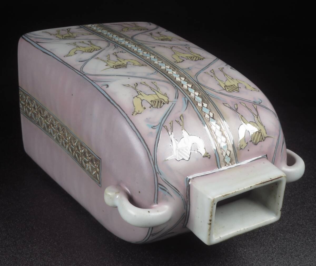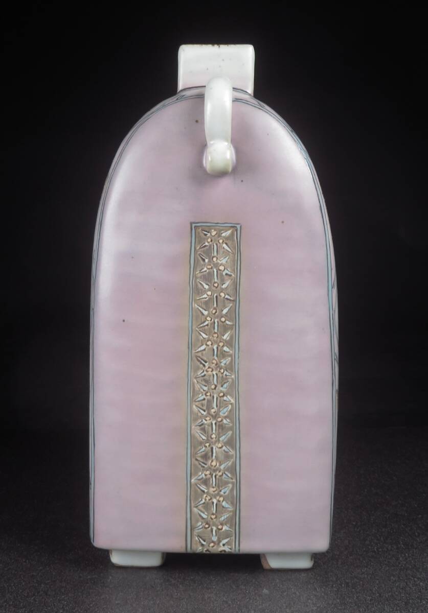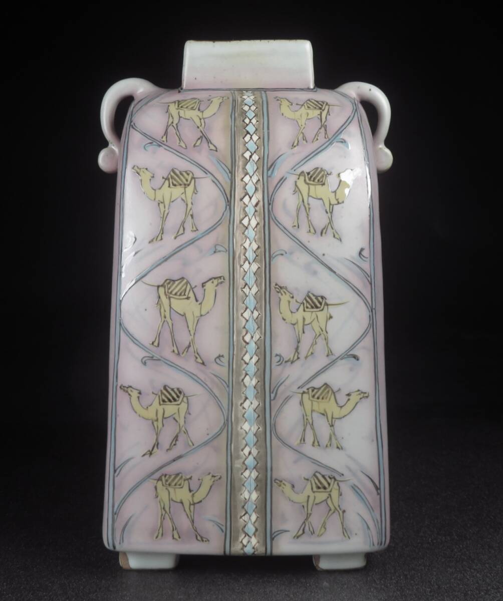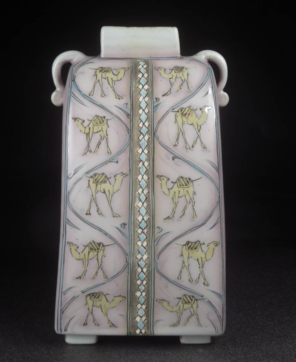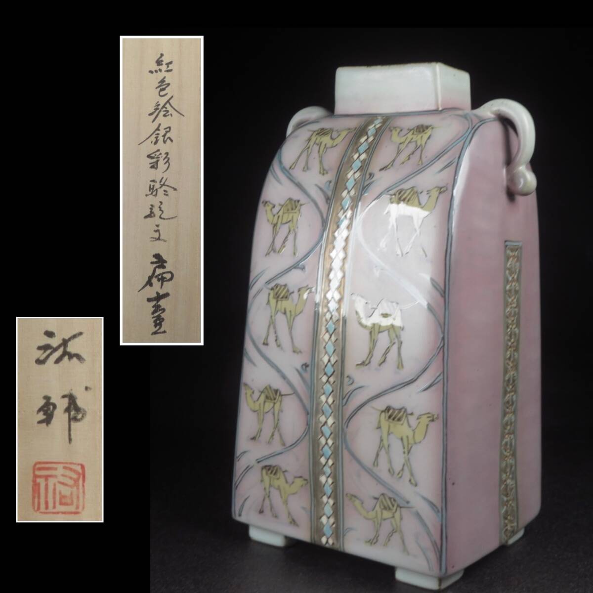 | 【SAKURAYA】秀逸作品【紅色絵銀彩駱駝文扁壷/有田焼の人気陶芸作家 宮崎祐輔】花瓶 飾壺 壷 扁壺 作家 共箱 細密絵付 高さ26cm | ||