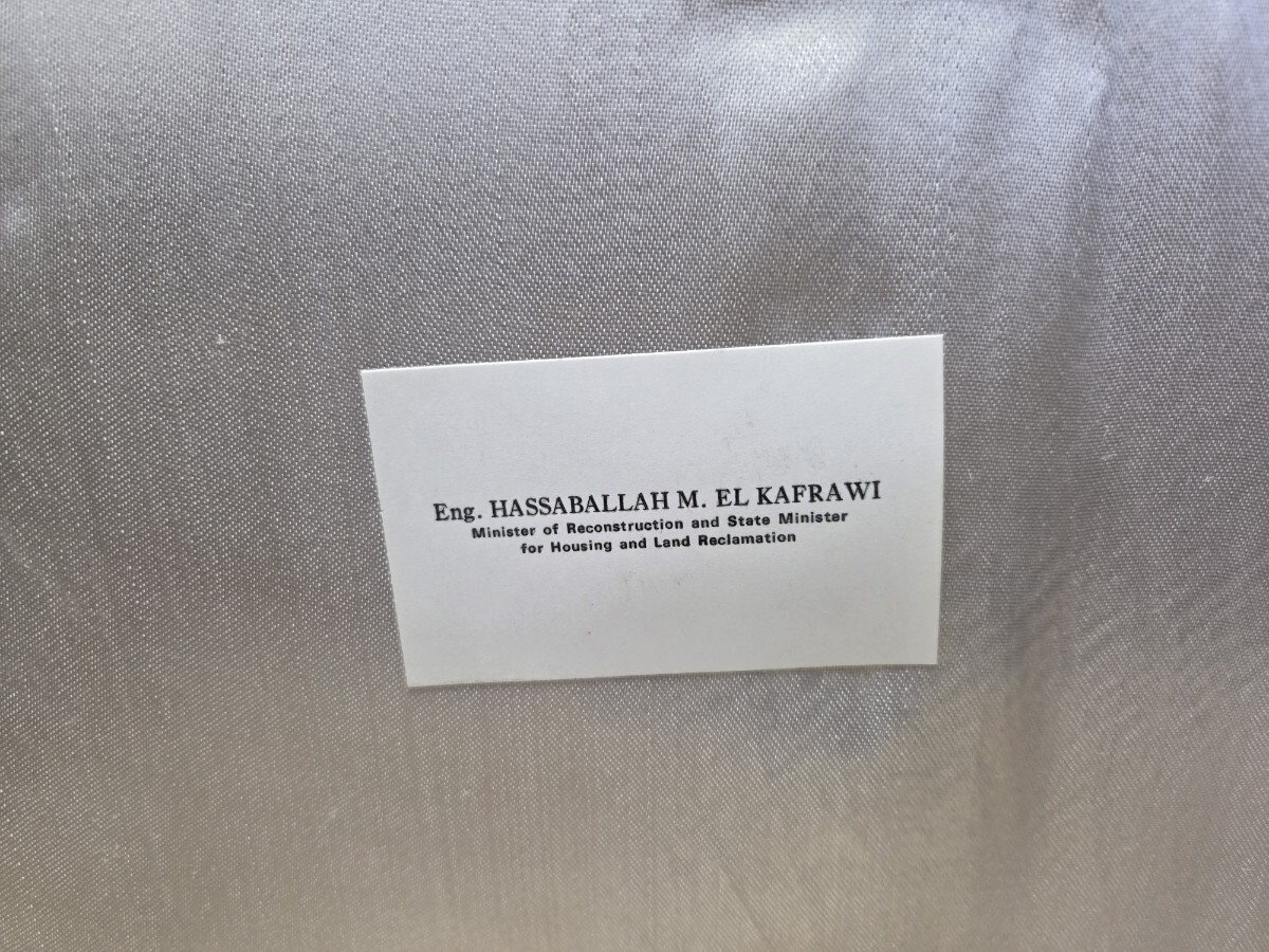 「元エジプトの復興・住宅・土地開拓担当国務大臣であったハッサバッラー・M・エル・カフラウィ氏の名刺です。」
