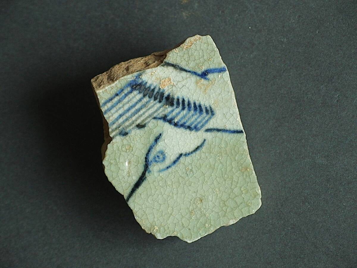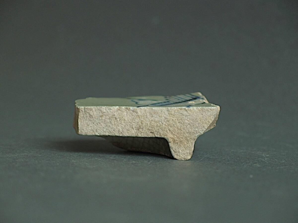 説 明 初期伊万里の名窯、百間窯で焼造された難技法、青磁白磁染付鷺図皿の陶片です。図録「初期伊万里の