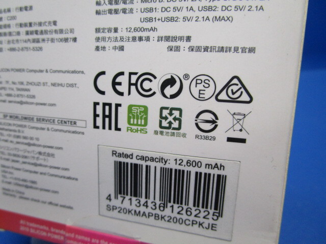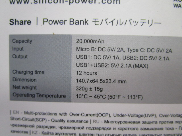 シリコンパワー Silicon Power モバイルバッテリー 2ポート出力(Type-A X2) 20,000mAh ブラック PSE認証品 SP20KMAPBK200CPKJE の商品スペック