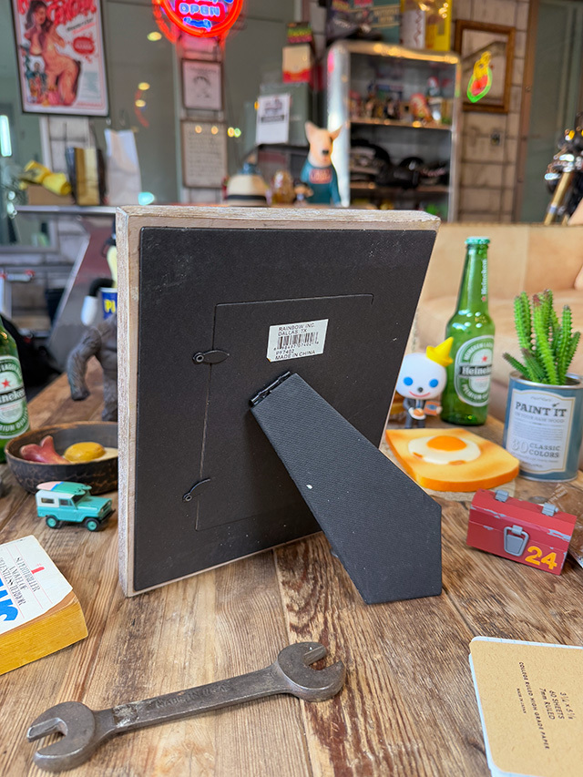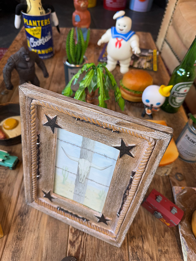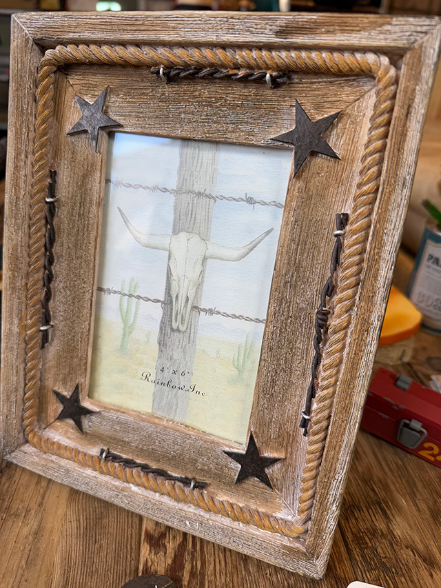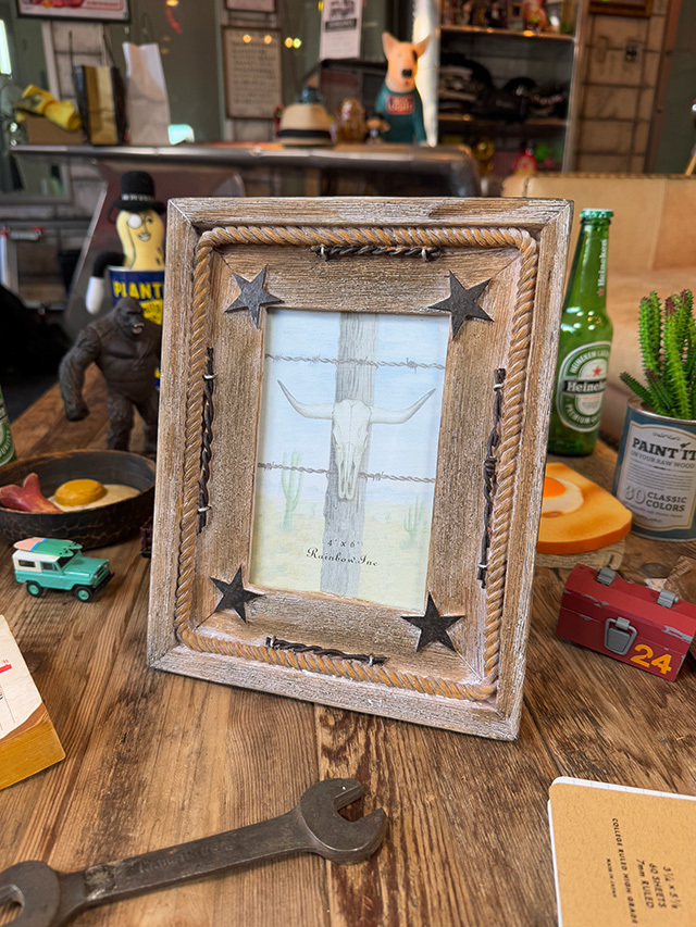 まるで古びたテキサスの酒場に飾られていそうな、味わい深いフォトフレームです。