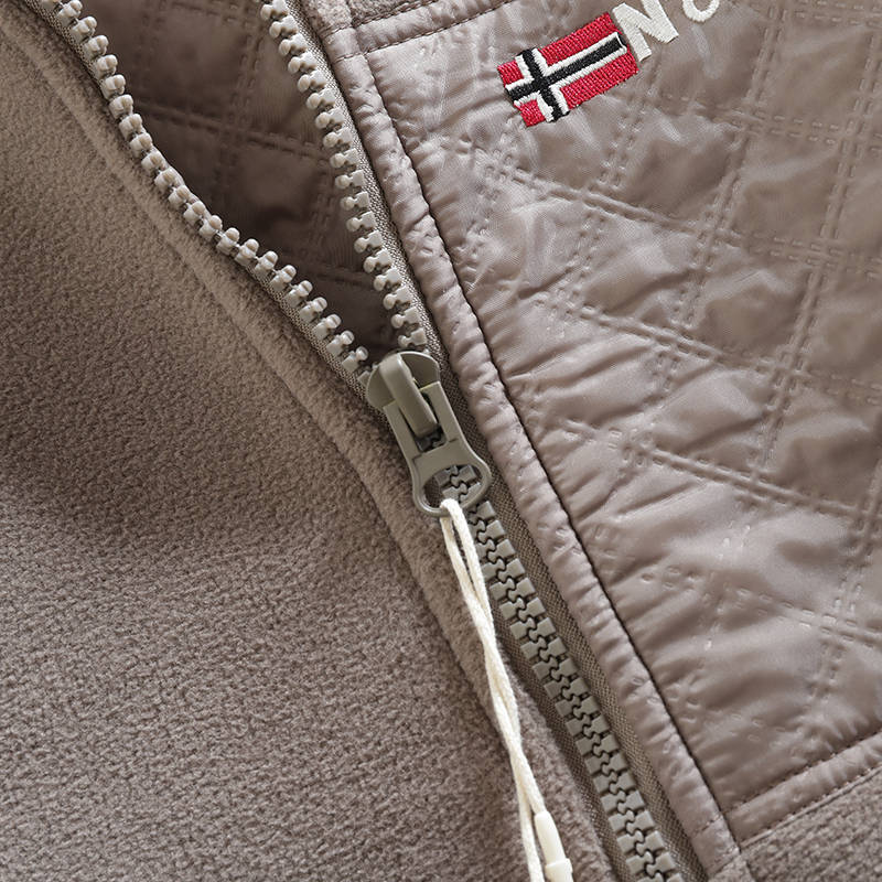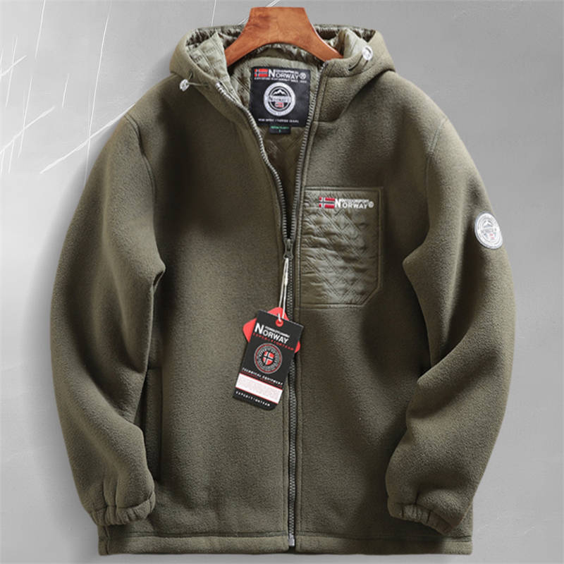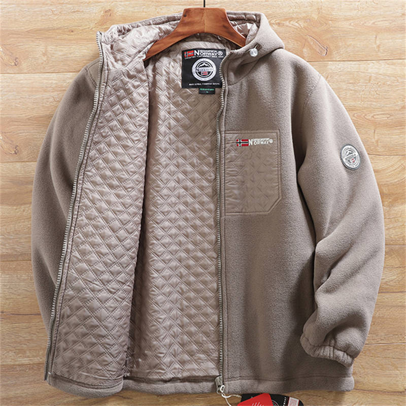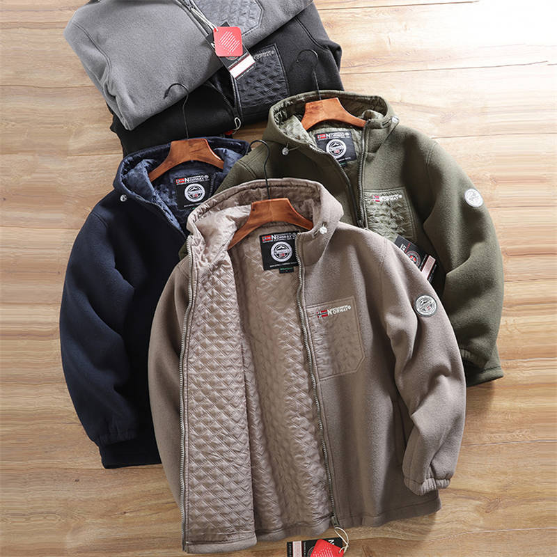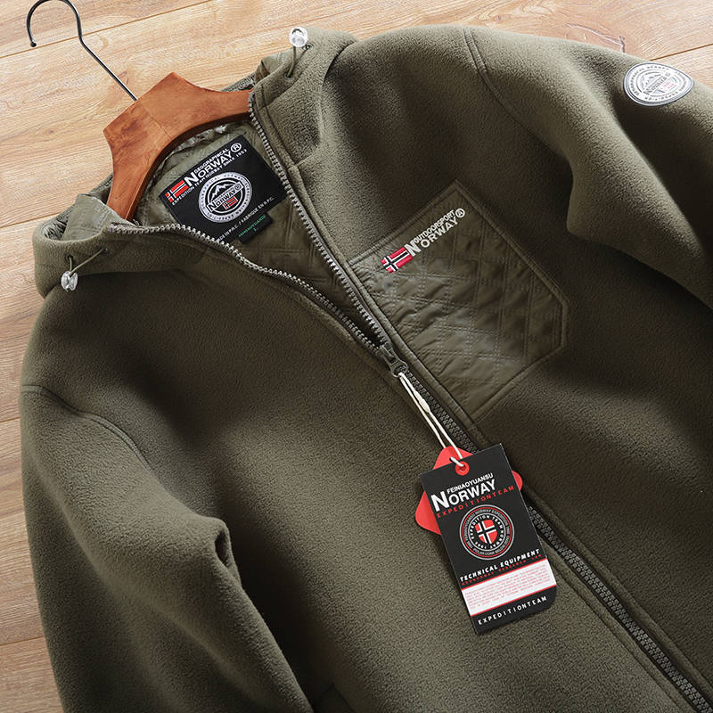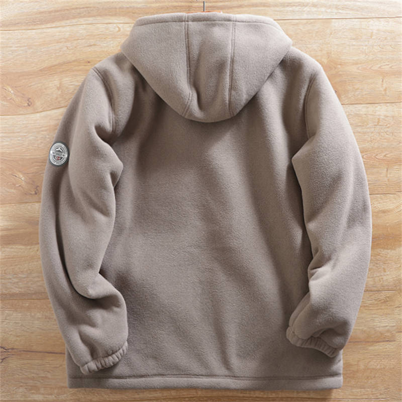 フリースジャケットはフード付き仕様で、防風性と保温性に優れています。冬でも首元から冷気が入りにくく、実用性の高い防寒アイテムです。