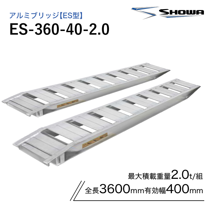積載重量は1本あたり1.0トンです 昭和ブリッジ 2.0トン(2.0t)ツメ式 全長3600mm/有効幅400mm【ES-360-40-2.0】2本組 全幅400mm自重26.5kg/1本 | ||