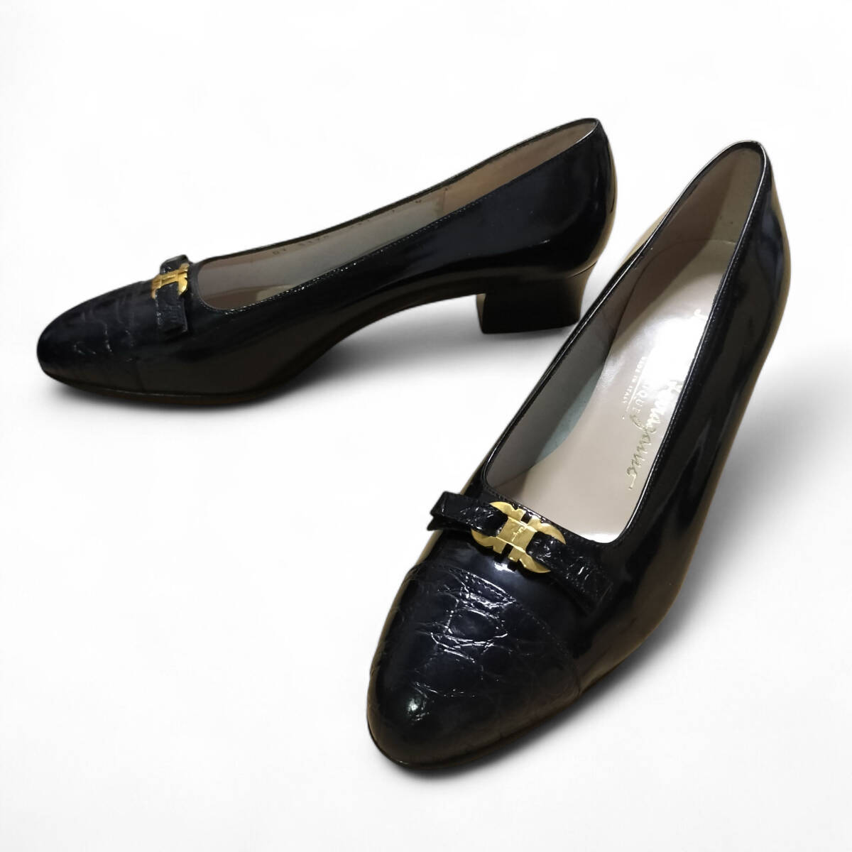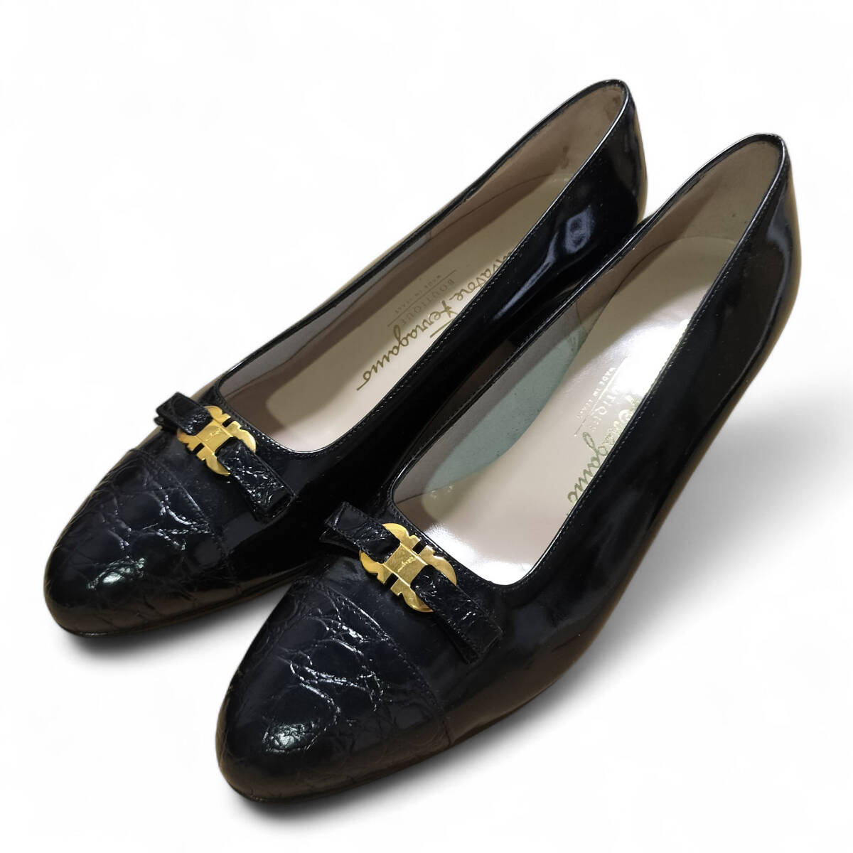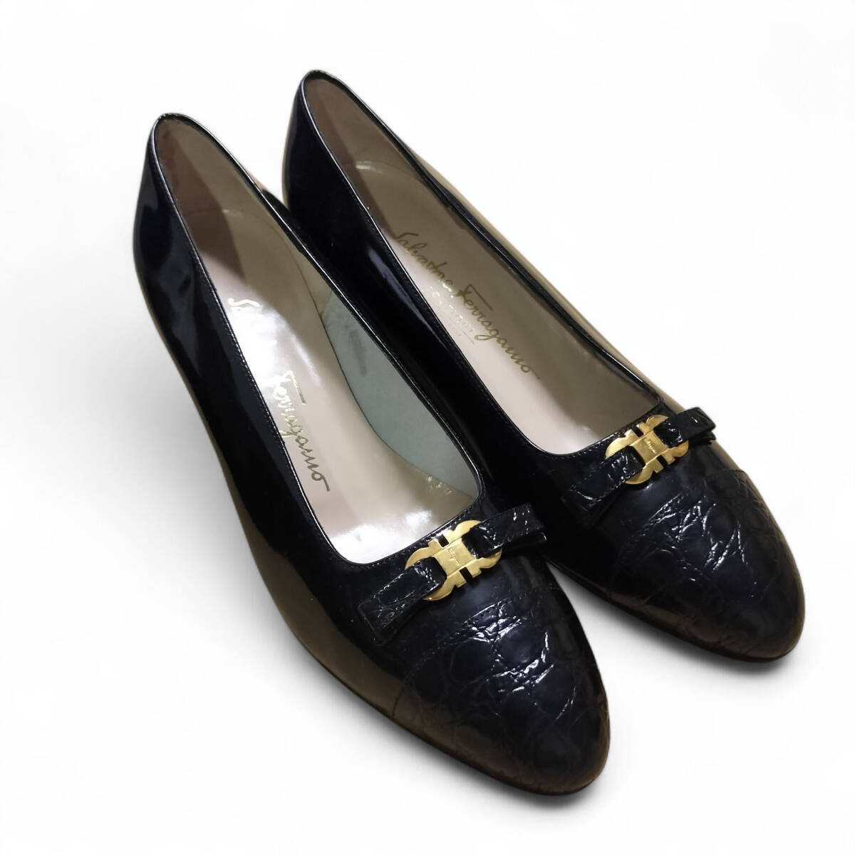 【美品】Salvatore Ferragamo サルヴァトーレフェラガモ フェラガモ パンプス ガンチーニ 7C 24cm相当 ブラック 黒 レザー ヒール