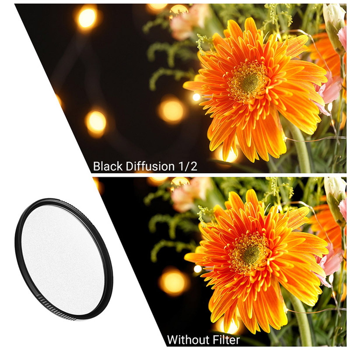 ブラックディフュージョンフィルターならではのソフトな描写 ブラックディフュージョン1/2 フィルターは、ピントの芯を保ったまま光を柔らかく拡散し、コントラストを抑えることで捉えた光をさらに美しく演出します。ポートレート撮影では肌の質感を整える効果があり、自然でなめらかな印象を持たせるとともに、レタッチ時の効率を上げることができます。 濃度の比較 分母の数が小さいほど、フィルター効果が上がります。 利便性を考慮したフィルター設計 金属製の枠でしっかりと装着でき、密閉性に優れ、ケラレにくい薄枠設計。ドイツSCHOTT社製B270光学ガラスとMRC(※)ナノコーティングの組み合わせにより、解像感を保ったまま不要な反射を抑えます。また撥水・撥油効果もあるので、汚れが付着しても簡単に落とすことができます。 仕様