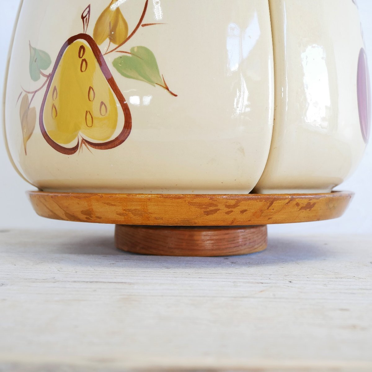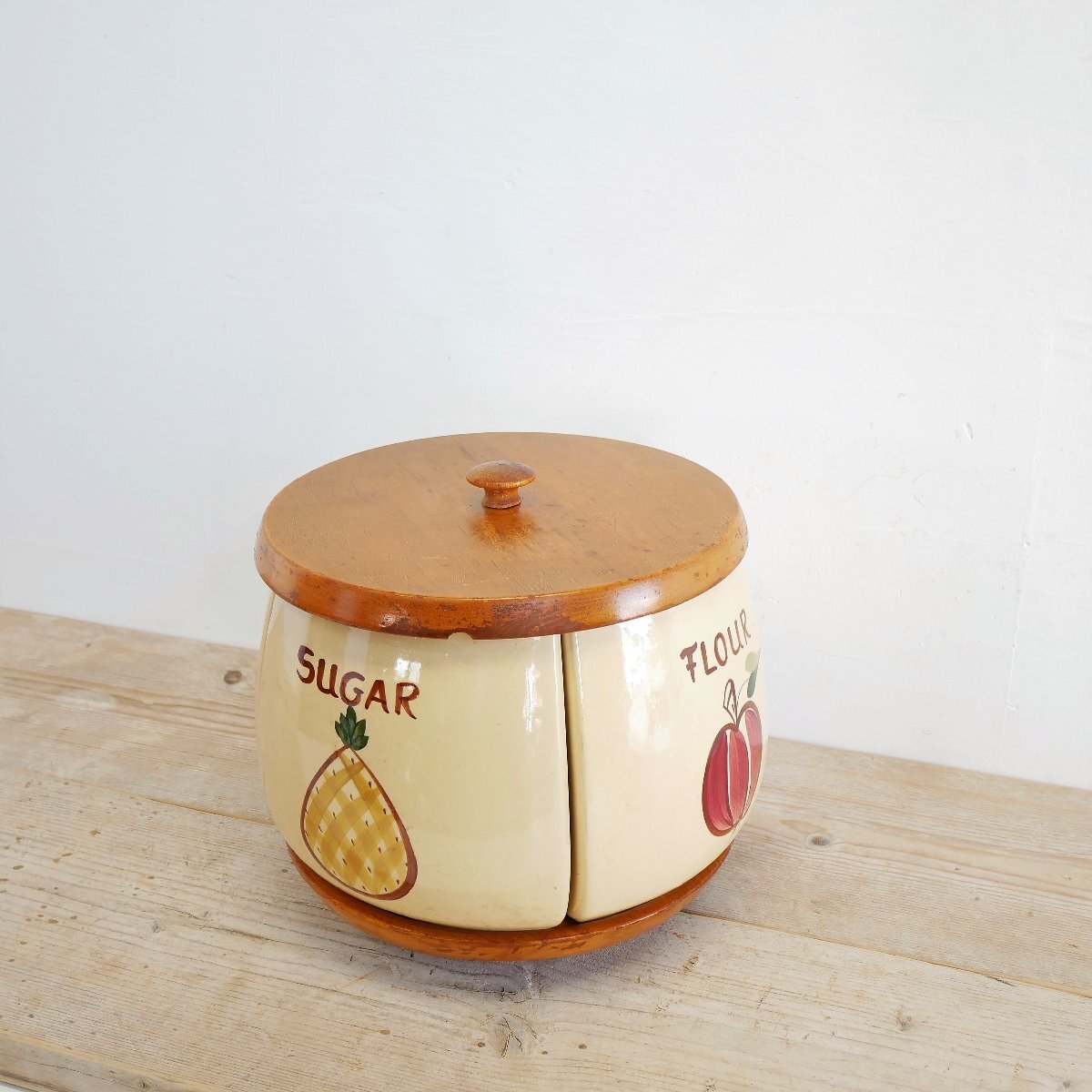 | 商品説明 explanation | 1962年製造の「ESMOND U.S.A.」のキャニスターです。※陶器製 回転台に絵柄が素敵な容器が4つ乗っています。 カフェ風インテリアのアイテムにいかがでしょうか。 |
