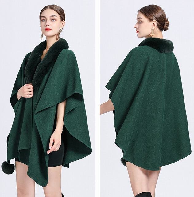 ニットポンチョ エコファー付き ストール マフラー ケープ レディース ふわふわ ポンポン フェイクファー アウター 毛皮コート グリーン