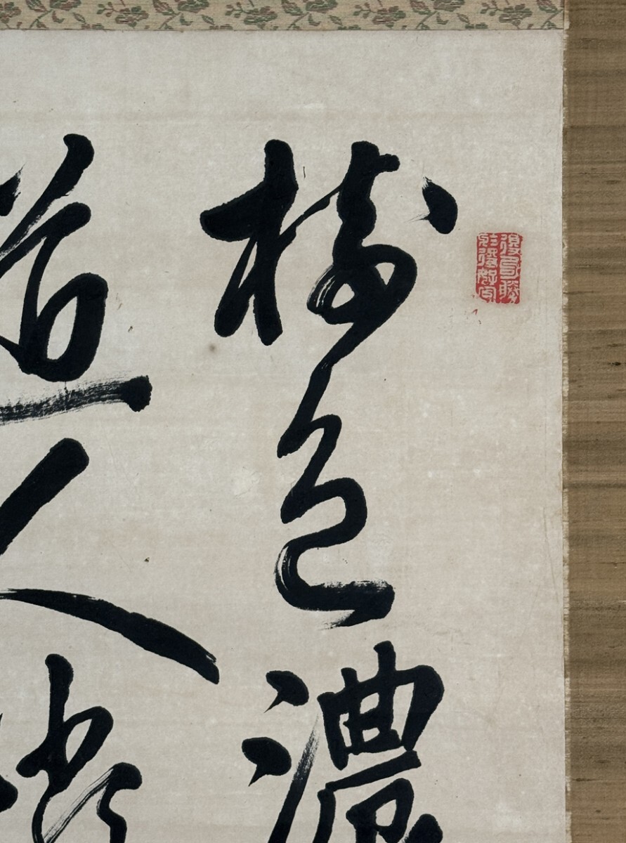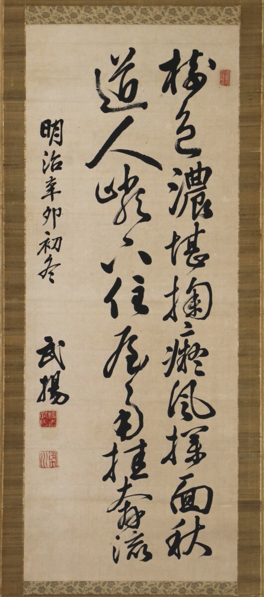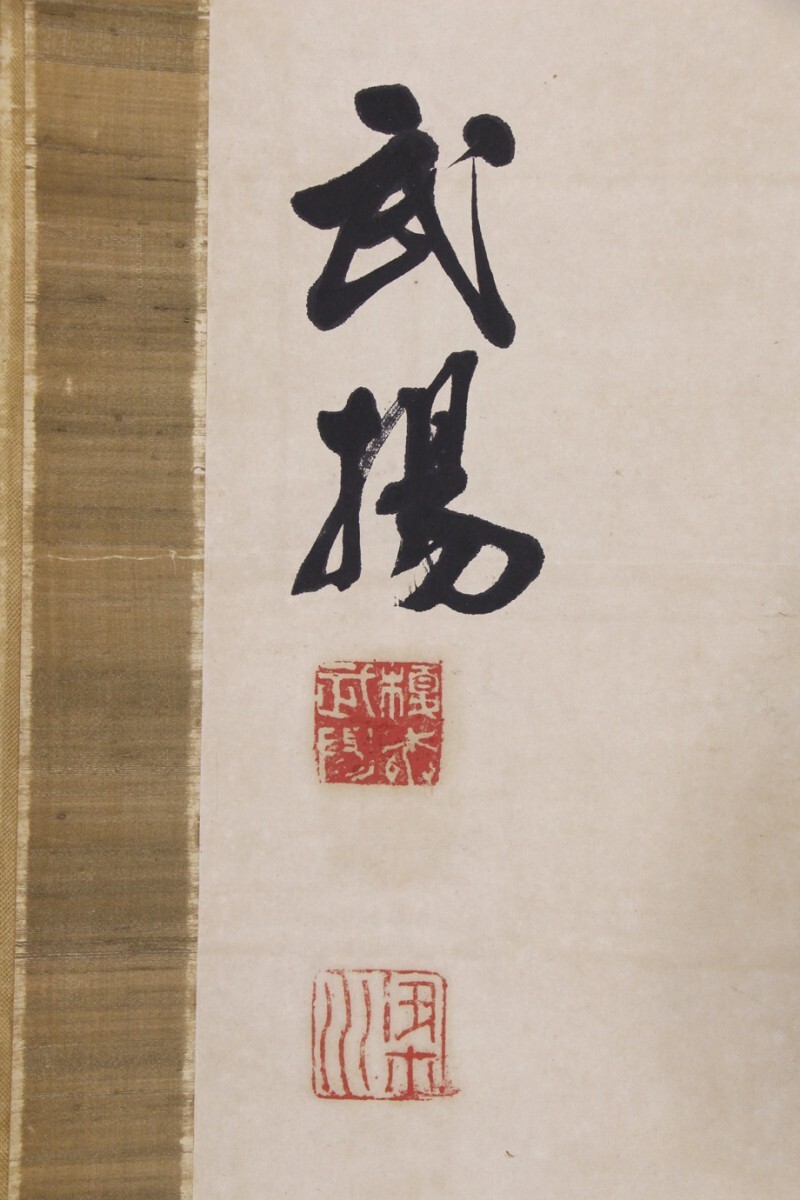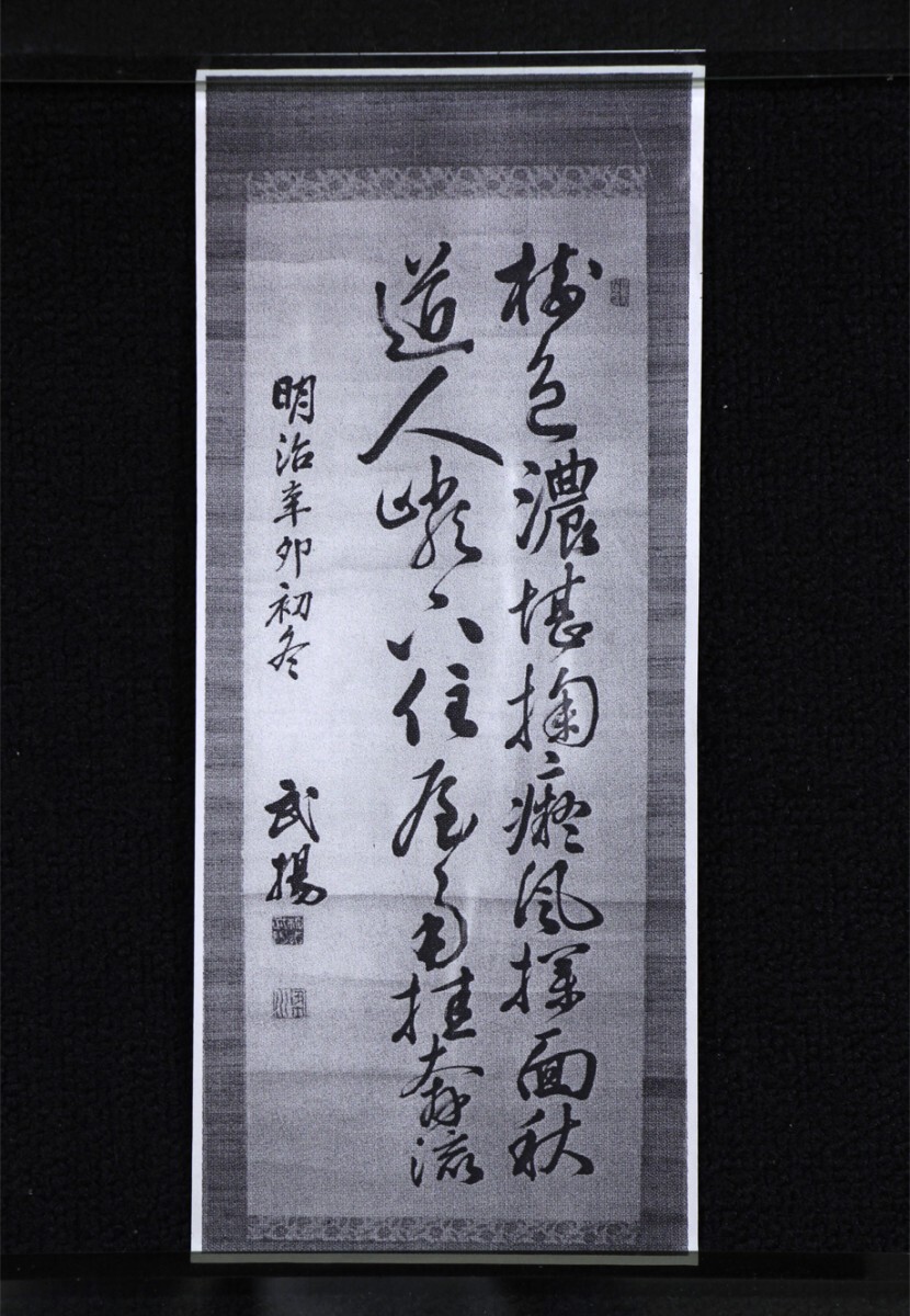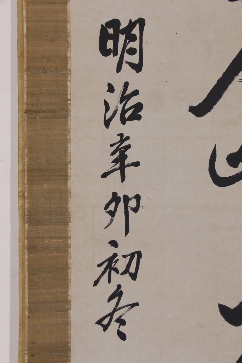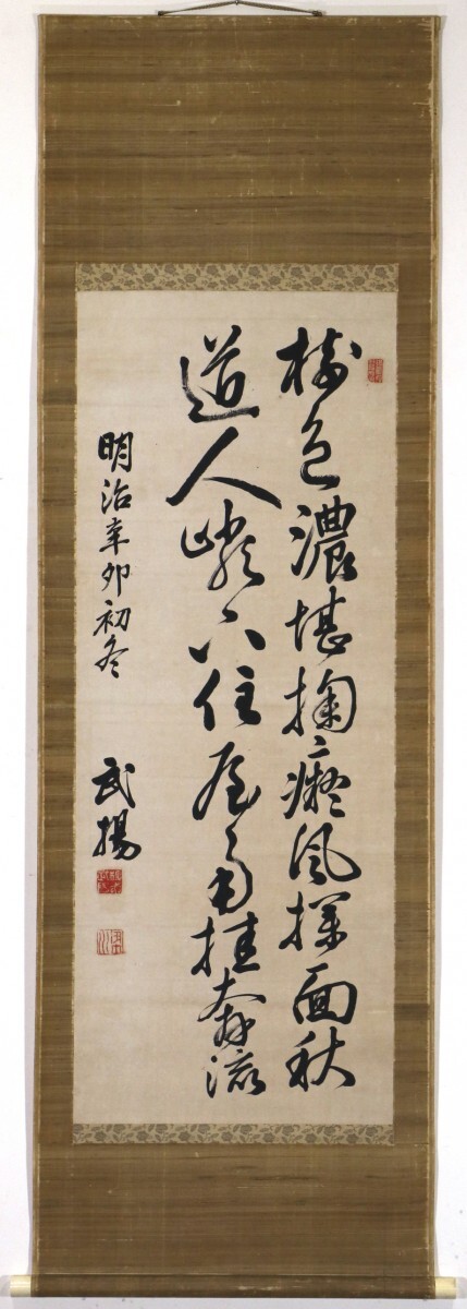 総丈サイズ…横 64.5 × 縦 204.5 cm 紙本・箱入 明治24年(1891)61歳 読み有 状態…少オレ・微少シミ 表具少傷ミ 「樹色濃堪掬癡風撲雨秋 道人巌下住屋角挂奔流」 【印刷ではありません】 【真作】 榎本武揚 幕末~明治の幕臣・政治家・子爵。江戸生。通称は釜次郎、号は梁川。オランダに留学後、幕府の海軍副総裁となる。明治維新では五稜郭にたてこもり、官軍に抵抗し降伏。のちに許され、特命全権公使としてロシアと樺太千島交換条約を締結。海軍卿・農商務相・逓信相・文部相・外相を歴任。徳川育英会育英黌農業科設立(のちの東京農業大学)。明治41年(1908)歿、73歳。 |