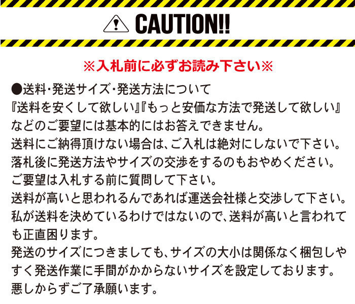 | ●送料は落札者様負担になります。 ●取引ナビ(ベータ版)で出品致しておりますので、ご落札者様からご連絡をお願い致します。 ●ご落札者様よりご連絡を頂いた後、送料をご連絡させて頂きます。 ●こちらの商品は単品購入の場合、下記のいずれかで発送させて頂きます。(ご選択下さい。) ①ゆうパック(おてがる版)【60】サイズ ②ゆうパケット(おてがる版)全国一律230円 ●ゆうパック(おてがる版)の各地域送料につきましては、オークションページ下部【配送方法】にてゆうパック(おてがる版)料金表リンクが貼り付けられておりますので、そちらをご参照下さいm(__)m ●ゆうパック(おてがる版)は配送日の指定ができません。取引メッセージで配達日の指定をされる方がおられますが、基本的に配達日指定にはお答えできませんのでご了承下さい。 ●入札後・落札後に発送方法や発送サイズの変更を希望したり、交渉するのはおやめください。基本的にこの『発送方法・送料』の欄に記載している内容を、入札者様・落札者様の希望で変更することはございません。ご希望がありましたら、必ずご入札前に質問にてお問い合わせ下さいますようお願いいたします。 |