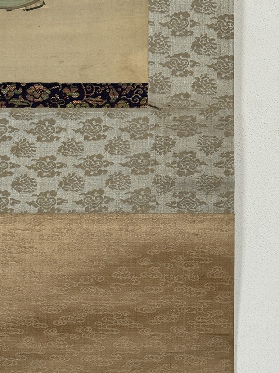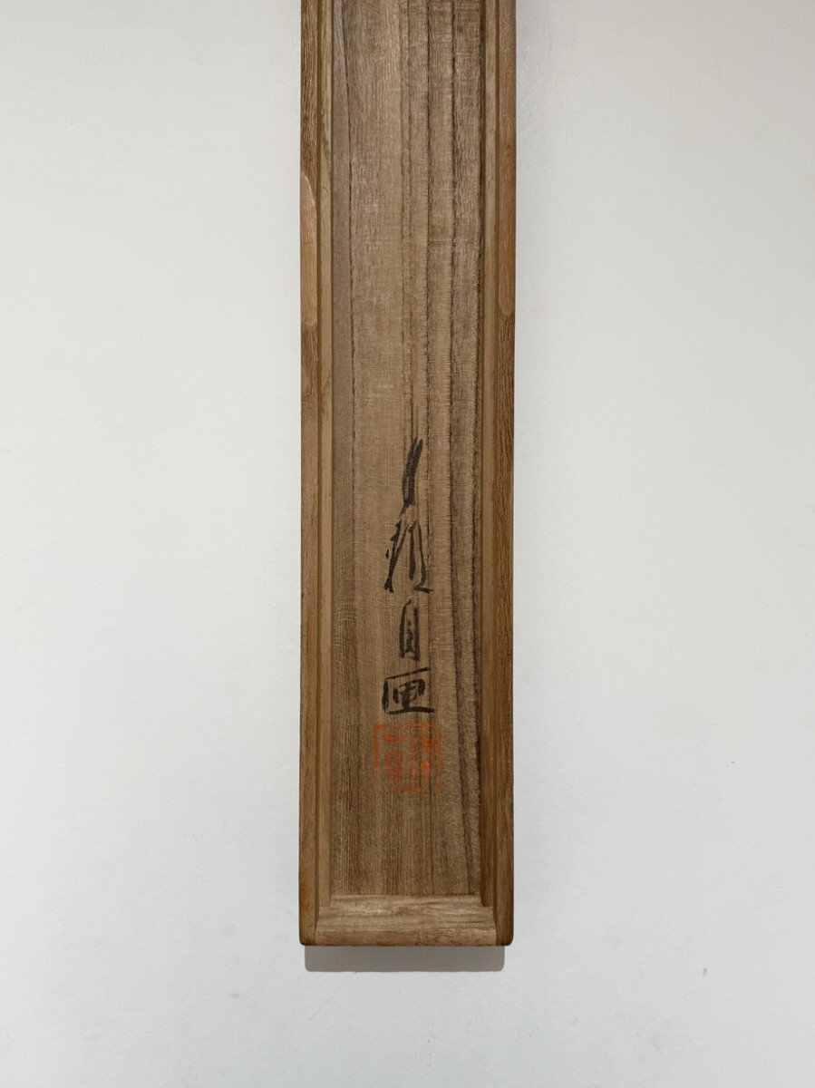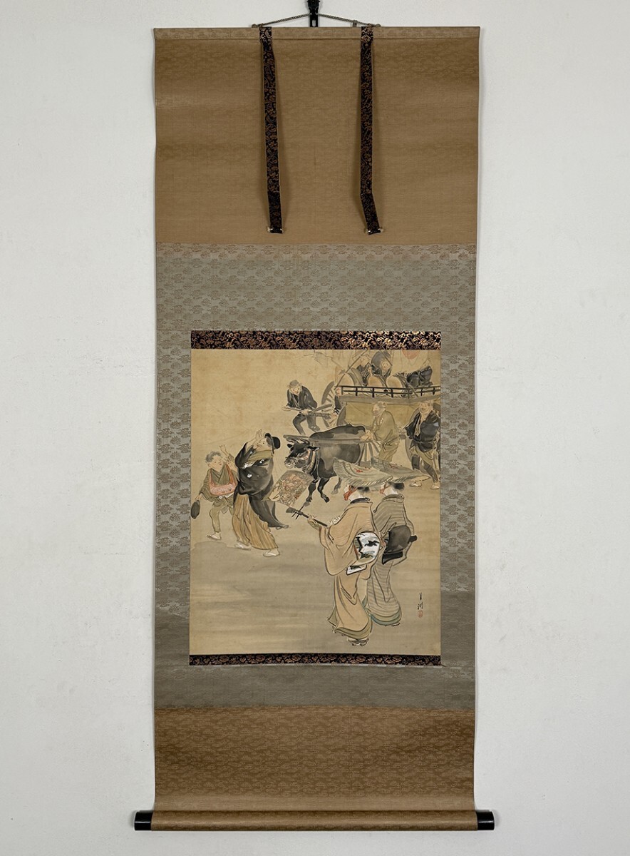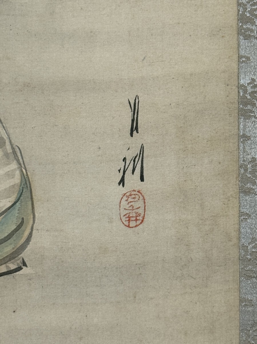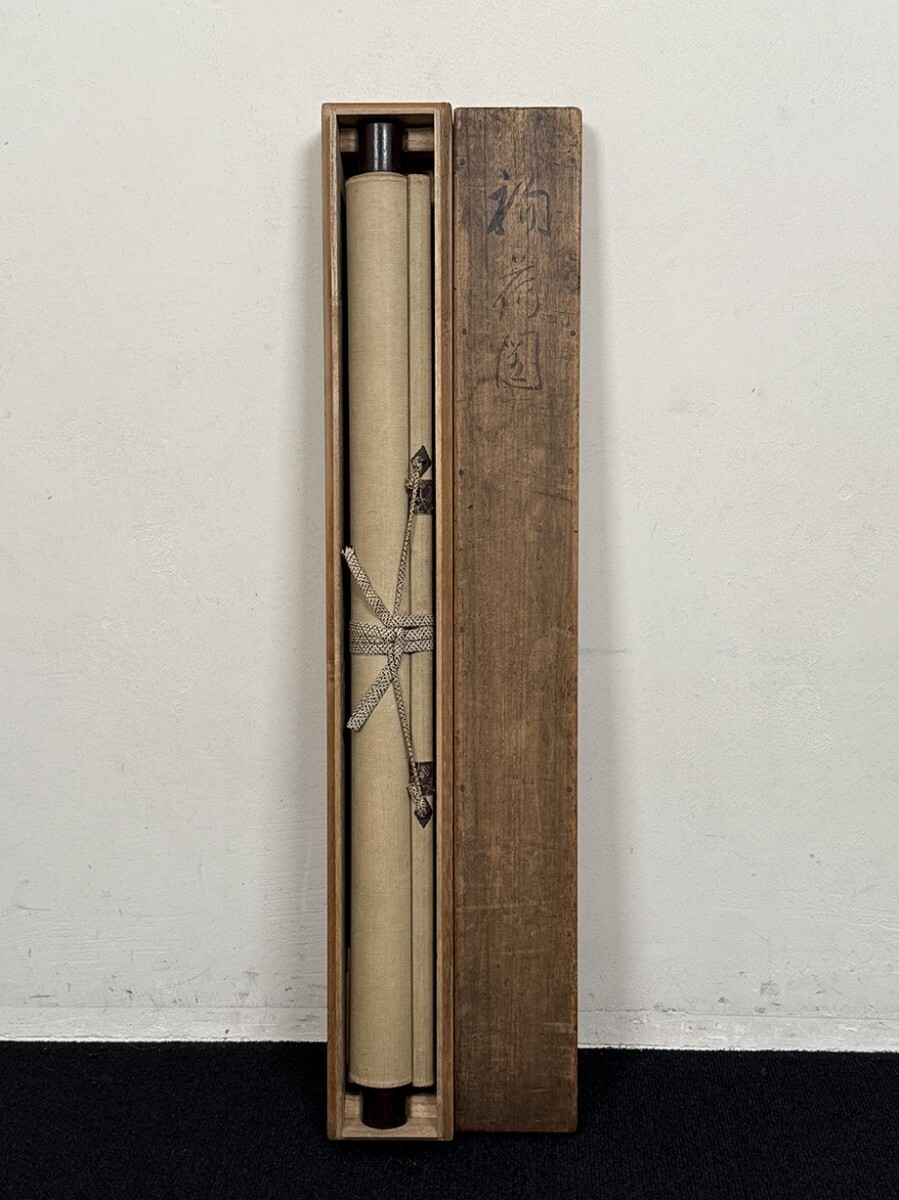 総丈サイズ…横 57.5 × 縦 143.5 cm 絹本着色・共箱 状態…表具微少シミ 本紙少シミ・傷ミ 【印刷ではありません】 【真作】 尾形月耕 明治~大正の浮世絵師、日本画家。江戸京橋生。本名は田井正之助。別号に桜斎、名鏡斎、華暁楼。のち尾形光哉の養子となり尾形姓となる。独学で絵を学び、菊池容斎に私淑。提灯屋を営む一方、絵ビラや人力車の蒔絵、輸出用陶器の下絵などを描いて画技を磨き、明治20年代には水野年方とともに新聞挿絵の双璧として絶大な人気を誇った。文芸雑誌の口絵や小説の挿絵も手掛け、また風俗をかいた錦絵『月耕漫画』などの制作にもあたった。大正9年(1920)歿、61歳。 |