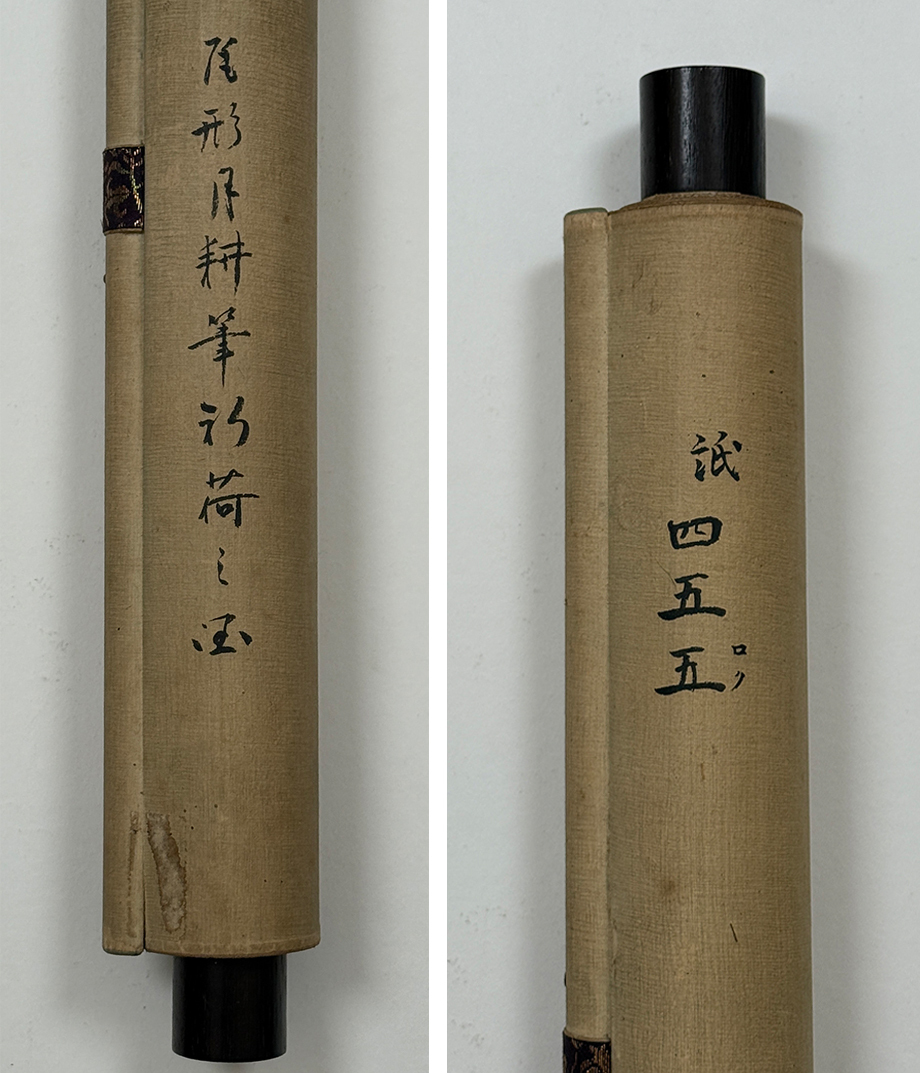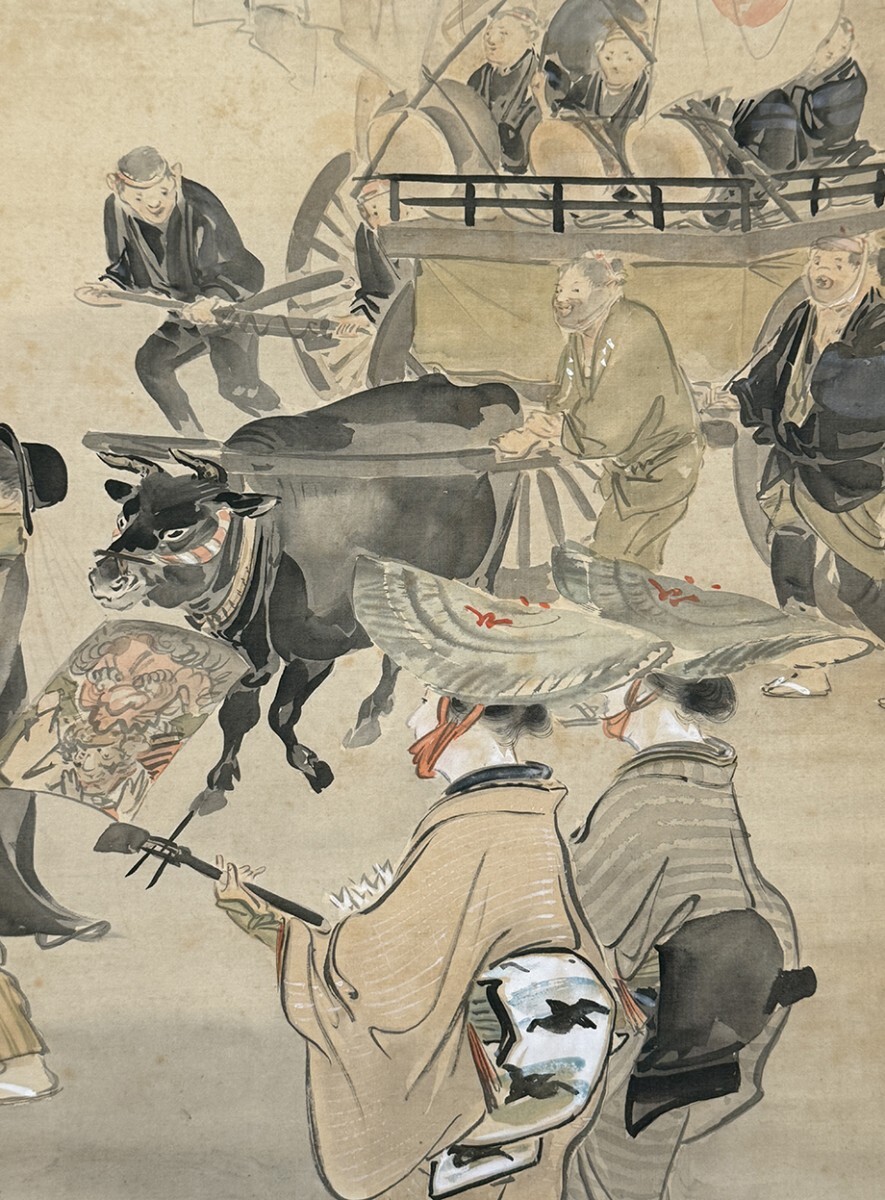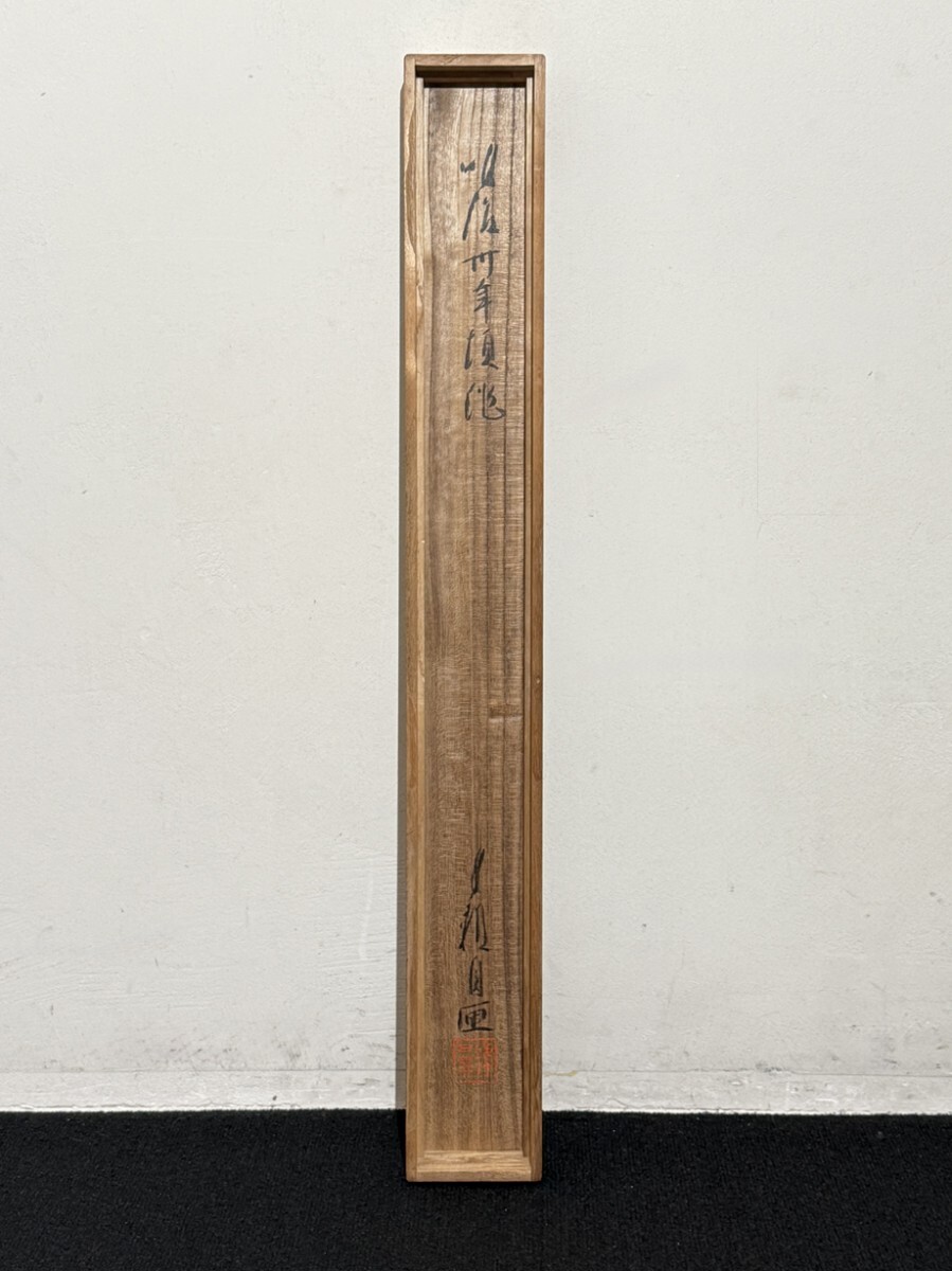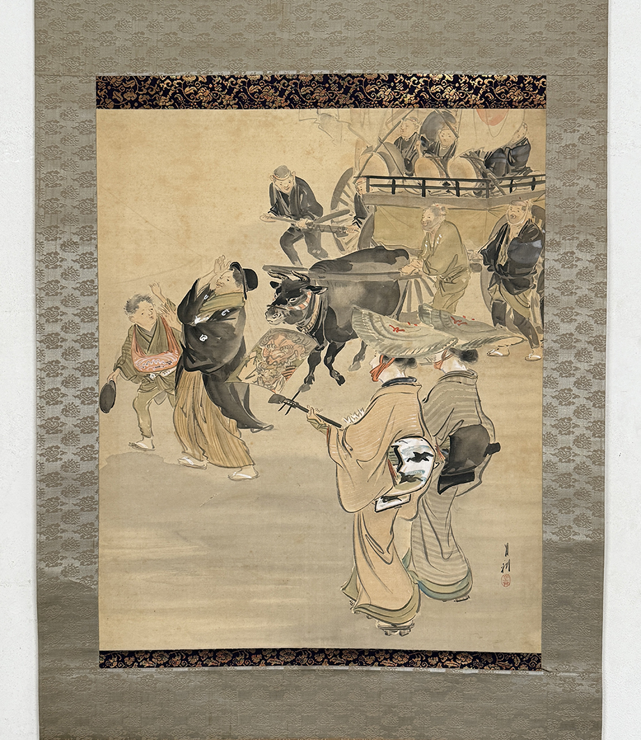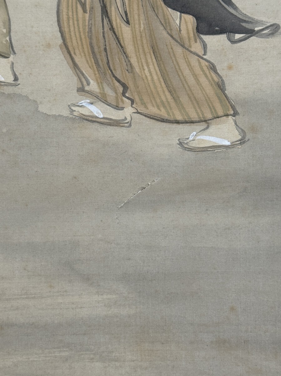 総丈サイズ…横 57.5 × 縦 143.5 cm 絹本着色・共箱 状態…表具微少シミ 本紙少シミ・傷ミ 【印刷ではありません】 【真作】 尾形月耕 明治~大正の浮世絵師、日本画家。江戸京橋生。本名は田井正之助。別号に桜斎、名鏡斎、華暁楼。のち尾形光哉の養子となり尾形姓となる。独学で絵を学び、菊池容斎に私淑。提灯屋を営む一方、絵ビラや人力車の蒔絵、輸出用陶器の下絵などを描いて画技を磨き、明治20年代には水野年方とともに新聞挿絵の双璧として絶大な人気を誇った。文芸雑誌の口絵や小説の挿絵も手掛け、また風俗をかいた錦絵『月耕漫画』などの制作にもあたった。大正9年(1920)歿、61歳。 |