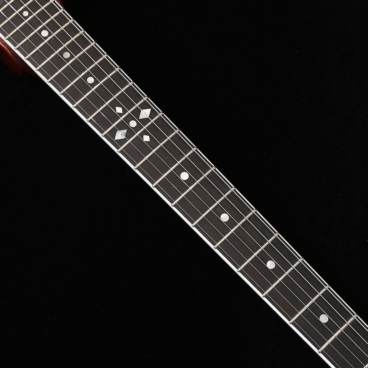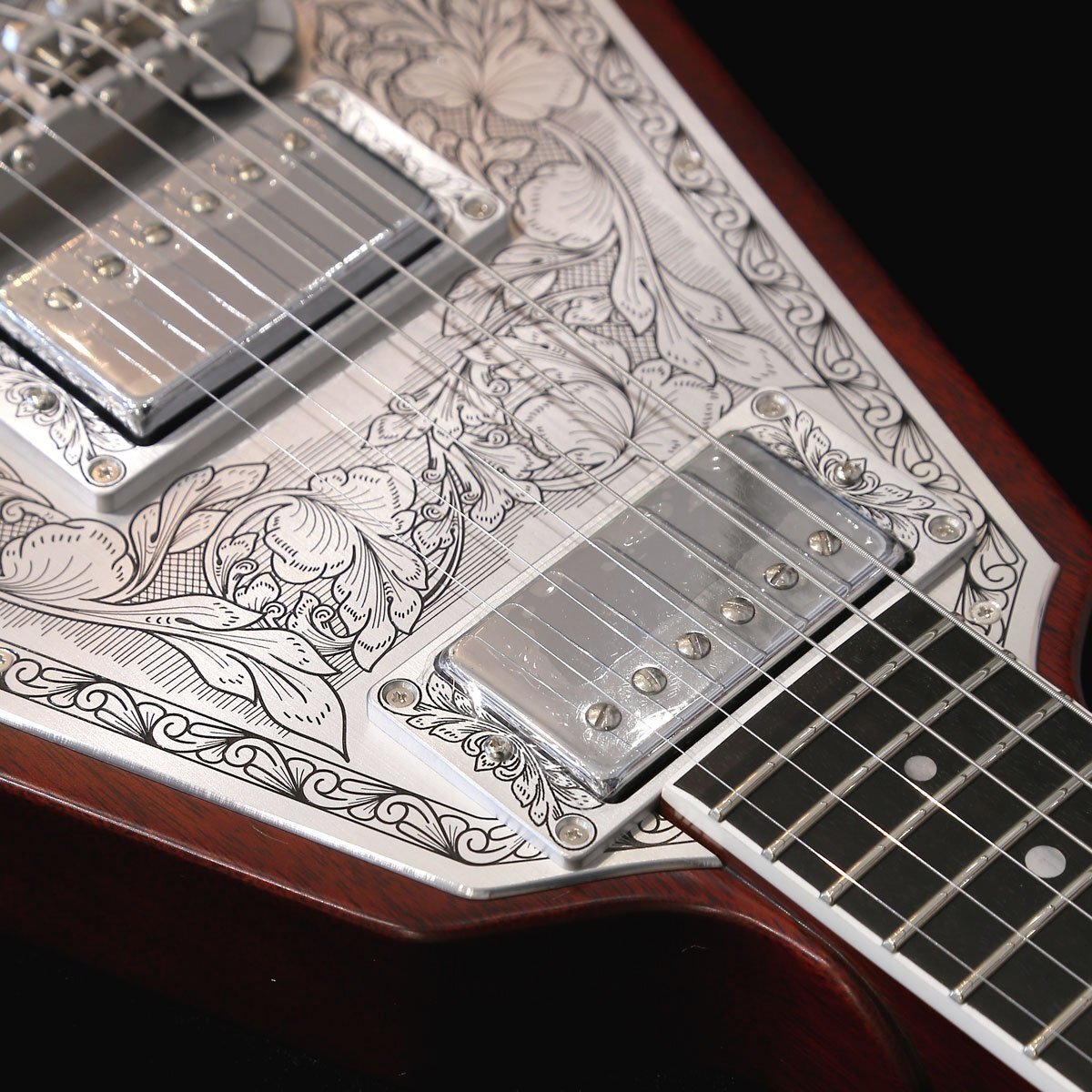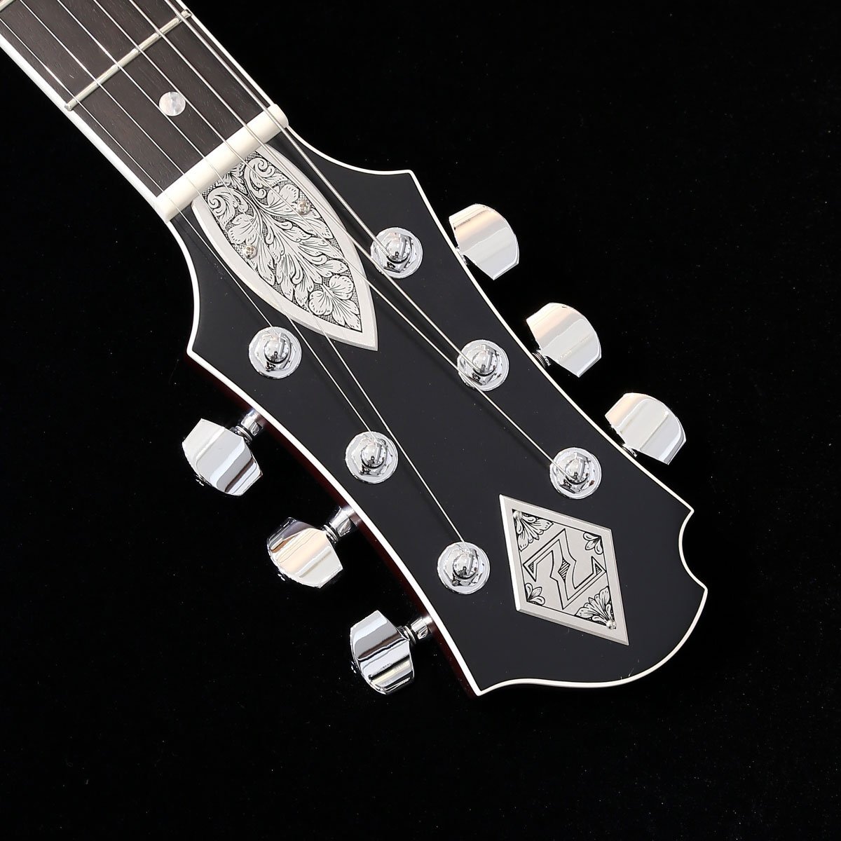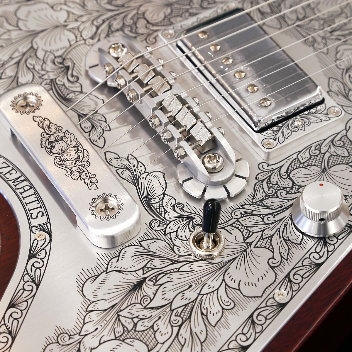 トップに彫金装飾を用いたゼマイティス・メタル・フロント・モデル「MFV22」は、ハイ・フレットでの演奏性を考慮し1弦側のボディーを若干カットしたオリジナルのVシェイプ・ボディーが印象的で、ボディーとネックには良質なマホガニー、フィンガーボードはエボニーを使用しています。 635mmのスケールで、セット・ネック・ジョイント、ミディアム・サイズの22フレット仕様です。 ボディー・トップの大きなアルミ合金プレート全面に、ゼマイティスらしいリーフ・デザインの彫金装飾が刻まれたクラシックなルックスが特徴です。 ゼマイティス・オリジナルのアルミ合金を使用したブリッジ&テイルピースを搭載し、ゼマイティス独自のトーンを生み出す要素となっています。 同様にアルミ合金を用いたヘッドのダイアモンド・エンブレム、トラスロッド・カバー、テイルピースやピックアップ・リングをはじめ、コントロール&スイッチ・バック・プレートに至るまで彫金を施しています。 ピックアップは、メタル・カバード・タイプのDragon Classicハムバッカーを2基搭載、コントロールは定評のあるCTSポットを使用し、シンプルな1ヴォリュームのレイアウトで、スイッチクラフト製の3ウェイ・ピックアップ・セレクター・スイッチを備えています。 ヴォリューム・コントロールとスイッチは演奏中の素早い操作が可能な位置に配置しています。 また、ヴォリュームを絞った際にもフル・ヴォリュームと変わらないトーンを実現するトレブル・ブリード・サーキットも導入しています。 アウトプット・ジャックは信頼性の高いスイッチクラフトを使用し、ボディー・トップに配置しています。 さらに信頼性の高いゴトー製で、激しい演奏でもチューニングの狂いを最小限に抑えるロック式チューナーを使用しています。 強いアタックや鋭いトーンを引き出すため、このモデルには敢えてニトロセルロース・ラッカーを使用せず、ポリウレタンを使用したマット・フィニッシュを採用しています。 英国発祥のゼマイティスらしさや伝統的なメタル・フロントならではのデザインを前面に出ししつつ、最前線でプレイするギタリストやギター・テクニシャンたちへの徹底的なヒヤリングを重ね、現代のプレイヤーが求める要素を注入したモデルに仕上がっています。 カラーは、ナチュラルです。 頑丈な専用ハードケースが付属します。 ●ハイ・フレットでの演奏性を考慮した1弦側のボディー・カット ●演奏中の素早い操作が可能な位置にレイアウトされたヴォリューム・コントロールとピックアップ・セレクター・スイッチ ●アルミ合金に彫金を入れた高級感のあるバック・プレートを装着 SPEC ■Body Top Material: Duralumin ■Body Back Material: Mahogany ■Neck Material: Mahogany ■Neck Joint: Set Neck ■Nut Width: 43mm (1-11/16") ■Nut Material: Bone ■Fingerboard Material: Bound Ebony ■Scale: 635mm (25") ■Frets: 22 Medium ■Neck Pickup: Dragon Classic Neck ■Bridge Pickup: Dragon Classic Bridge ■Radius: 305mm (12") ■Controls: 1 Volume, 3-Way Toggle ■Tuners: Gotoh SGV510 A01MG-T-Chrome ■Finish: Matt (Polyurethane) ■Strings: Rotosound Nickel Plated Steel (.010, .013, .017, .026, .036, .046) ■Color: Natural ■Protection: Hard Shell Case |