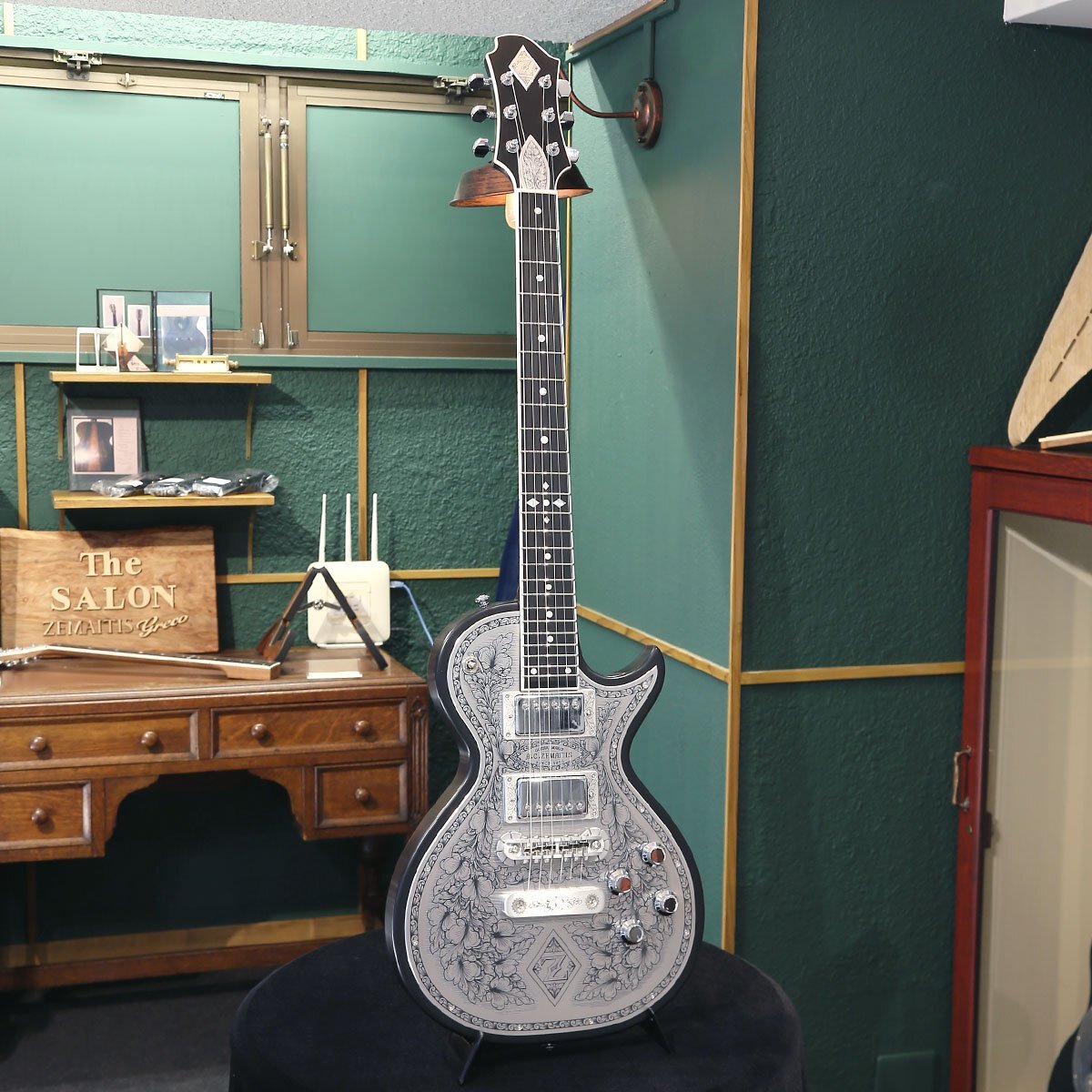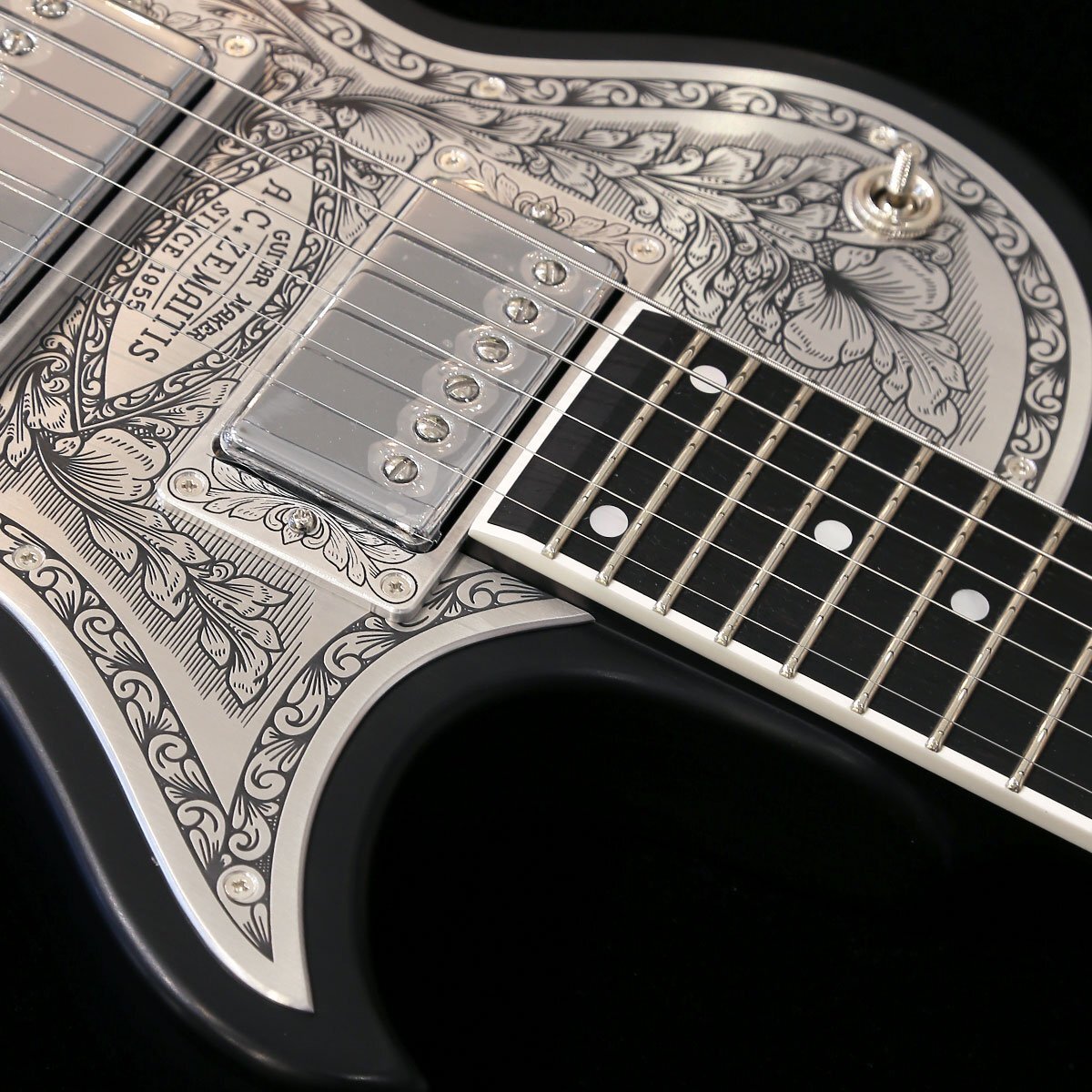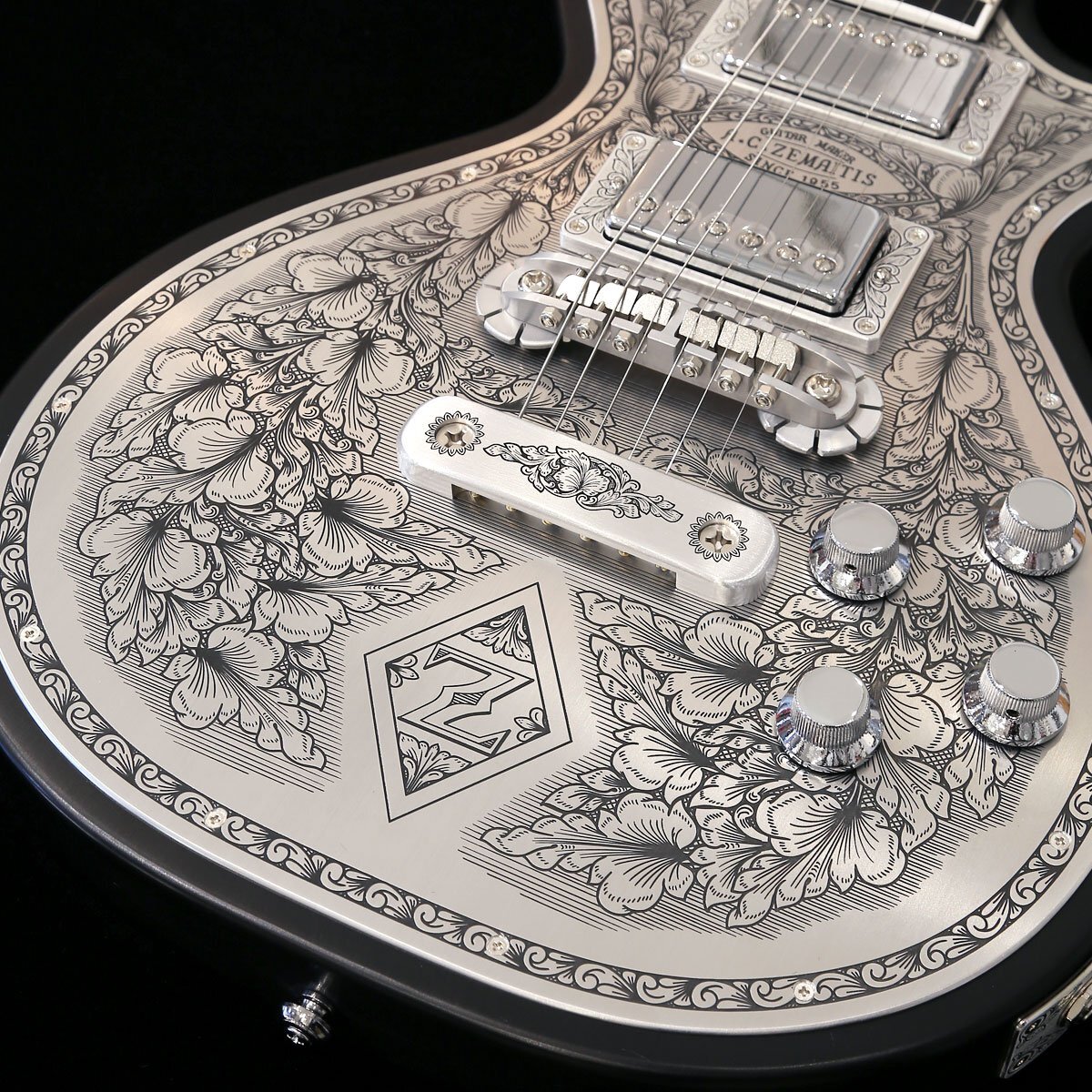 ゼマイティスより、トップに彫金装飾を用いたメタル・フロント・モデル「MFG-AC-24 Diamond & Z」が登場しました。 MFG-AC-24はウェストのくびれが大きいシングル・カッタウェイのボディー・スタイルで、ボディーとネックに厳選されたアフリカン・マホガニー、フィンガーボードはエボニーを使用しています。 635mmのスケールで、セット・ネック・ジョイント、ミディアム・サイズの24フレット仕様で、ブリッジ後方に「Diamond & Z」のデザインを採り入れたモデルです。 「ヘッドに取り付けているダイアモンド・エンブレムを、メタル・ピックガードのデザインに採り入れてみてはどうか?」という発想が元になり、生まれたデザインです。 ゼマイティス・オリジナルのアルミ合金を使用したブリッジ&テイルピースを搭載し、ゼマイティス独自のトーンを生み出す要素となっています。 同様にアルミ合金を用いたヘッドのダイアモンド・エンブレム、トラスロッド・カバー、テイルピースやピックアップ・リングをはじめ、アウトプット・ジャック・プレート、コントロール&スイッチ・バック・プレートに至るまで装飾を施しています。 ピックアップは、メタル・カバード・タイプのDragon Classicハムバッカーを2基搭載、コントロールは定評のあるCTSポットを使用し、各ピックアップ・ヴォリュームと各ピックアップ・トーンのレイアウトです。 スイッチクラフト製の3ウェイ・ピックアップ・セレクター・スイッチを備え、トーンのキャパシターはオレンジ・ドロップを使用しています。 さらに信頼性の高いゴトー製のチューナーを使用しています。 フィニッシュはラッカーを使用し、カラーはナチュラルとブラックの2カラーをラインナップしています。 英国発祥のゼマイティスらしさや伝統的なメタル・フロントならではのデザインを前面に出しつつ、最前線でプレイするギタリストやギター・テクニシャンたちへの徹底的なヒヤリングを重ね、現代のプレイヤーが求める要素を注入したモデルに仕上がっています。 ●2つのピックアップの間には、「A.C.ZEMAITIS SINCE1955」の文字が彫金されている。 ●ピックアップ・リングは、最新の弦の角度にあわせたアングル付きではなく、あえて従来のフラット・タイプを合わせることでクラシックな印象を持たせた。 ●「ヘッドに取り付けているダイアモンドZバッジを、メタル・ピックガードのデザインに採り入れてみてはどうか?」という発想が元になり、生まれたデザイン。 ●Back View: アルミ合金に装飾を入れた高級感のあるバック・プレートを装着。 SPEC ■Body Top: Duralumin ■Body Back: Select African Mahogany ■Neck: Select African Mahogany ■Neck Joint: Set neck ■Nut Width: 43mm (1-11/16") ■Nut: Bone ■Fingerboard: Bound Ebony ■Scale: 635mm (25") ■Frets: 24 Medium ■Neck Pickup: Dragon Classic Neck ■Bridge Pickup: Dragon Classic Bridge ■Radius: 305mm (12") ■Controls: 2 volume, 2 tone, 3-way toggle ■Tuners: Gotoh SG301-01-Chrome ■Finish: Lacquer ■Protection: Hard Shell Case ■Strings: Nickel Plated Steel (.010, .013, .017, .026, .036, .046) ■Colors: Black ■Weight: 約4.0kg |