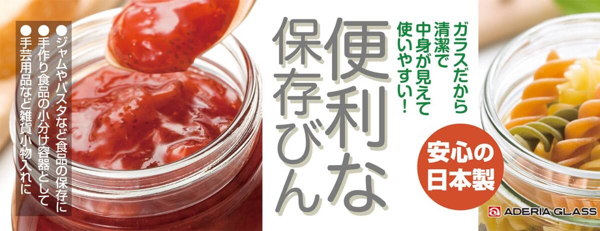 商品紹介 食べ物や小物など様々なものに使えるガラスの保存容器です。瓶、フタとも日本製です。 フタはスクリュー型(ねじ込み式)になっておりしっかりと中身を保存する事が可能です。 容量が200mlと小ぶりなので、ジャムやシロップを小分けして保存し、おすそ分けとしてお使い頂けます。また、ボタンやクリップ等の小物入れとしてお使い頂けます。 より ●シンプルな蓋が何を入れても様になる、使いやすい容器 ●食品の保存や雑貨小物入れなど・・・ ●飽きのこないデザインは、シーンを選ばずあらゆる用途に使える