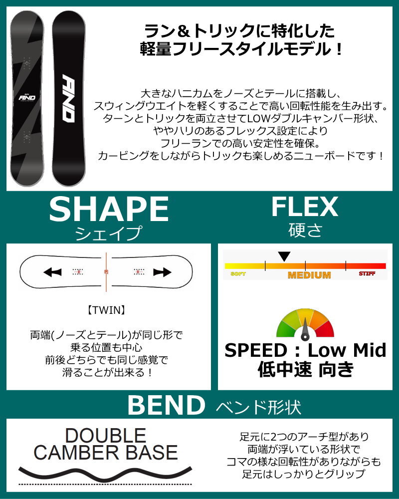 ラン&トリックに特化した軽量フリースタイルモデル!大きなハニカムをノーズとテールに搭載し、スウィングウエイトを軽くすることで高い回転性能を生み出す。ターンとトリックを両立させてLOWダブルキャンバー形状、ややハリのあるフレックス設定によりフリーランでの高い安定性を確保。カービングをしながらトリックも楽しめるニューボードです!