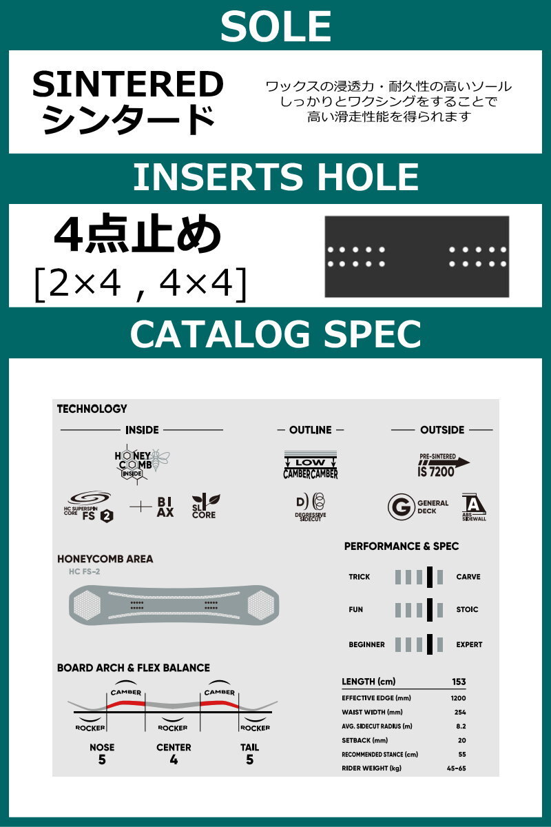 A lightweight freestyle model specialized for runs and tricks! Equipped with large honeycombs on the nose and tail, it lightens the swing weight and enhances high rotation performance. It balances turns and tricks, and the low double camber shape and slightly stiff flex setting ensure high stability during free runs. This is a new board that allows you to enjoy tricks while carving!
