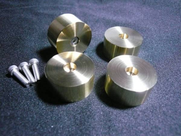 | 真鍮製、オーディオ インシュレーターです。4個セット サイズは 直径30mmx高さ15mmです。重さは1個、約90gです。 真鍮無垢材、削り出し、4個セットです。 中型、小型機器に適したサイズだと思います。 ボルトはM4x15mmキャップボルトが4本サービスで付きます。 |