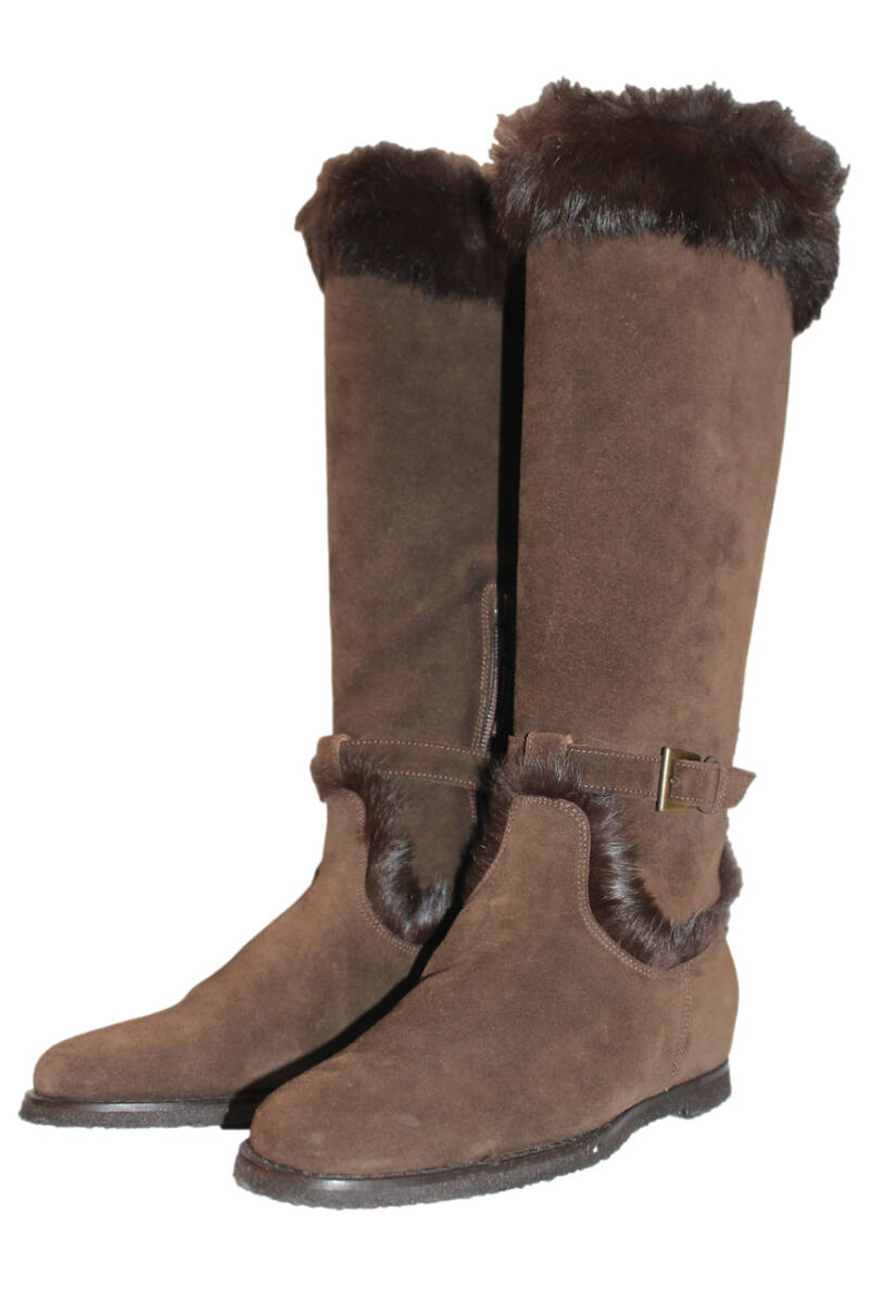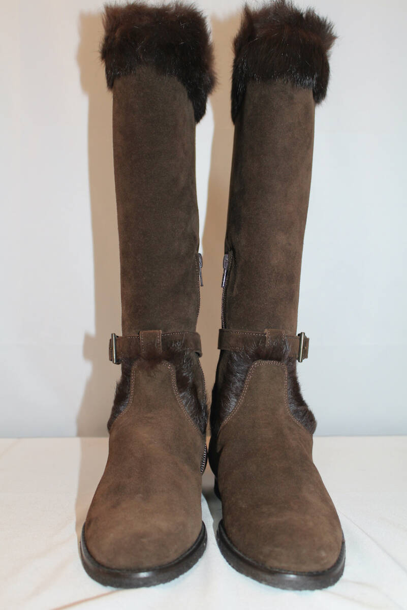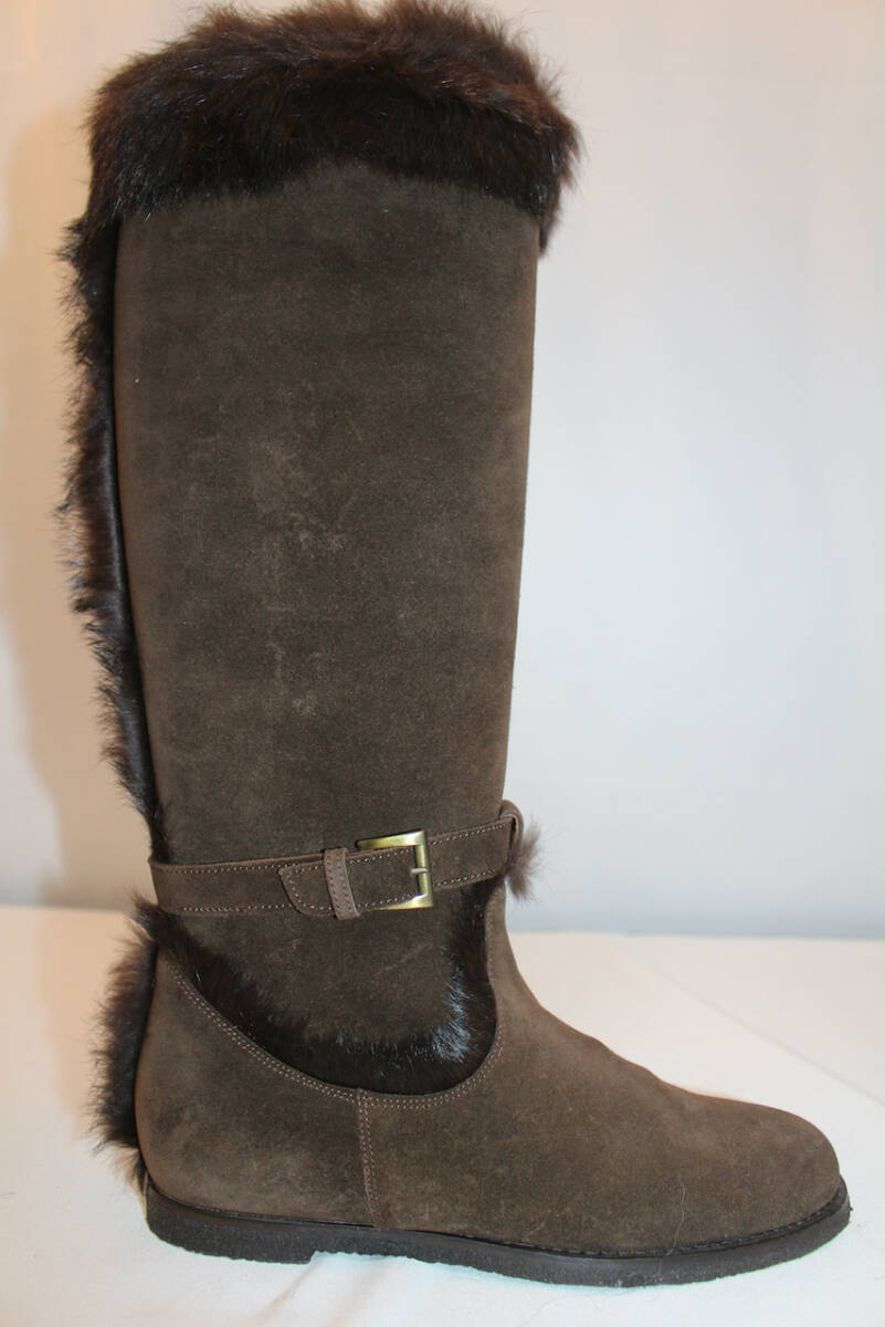 牛革、うさぎ毛皮、ブラウンカラー、ブーツの口幅17.5cm、ヒールの高さ2cm、ブーツの高さ40cm、定価118.650円、新品です。