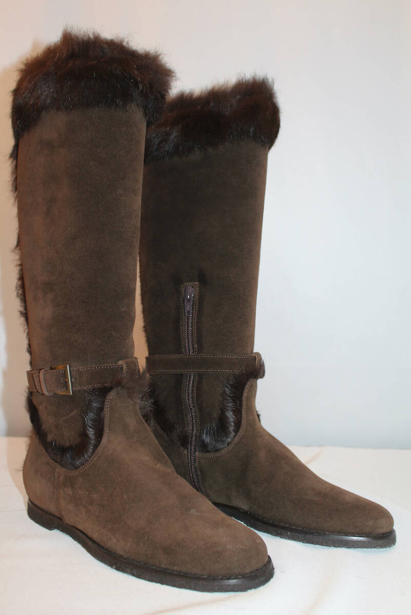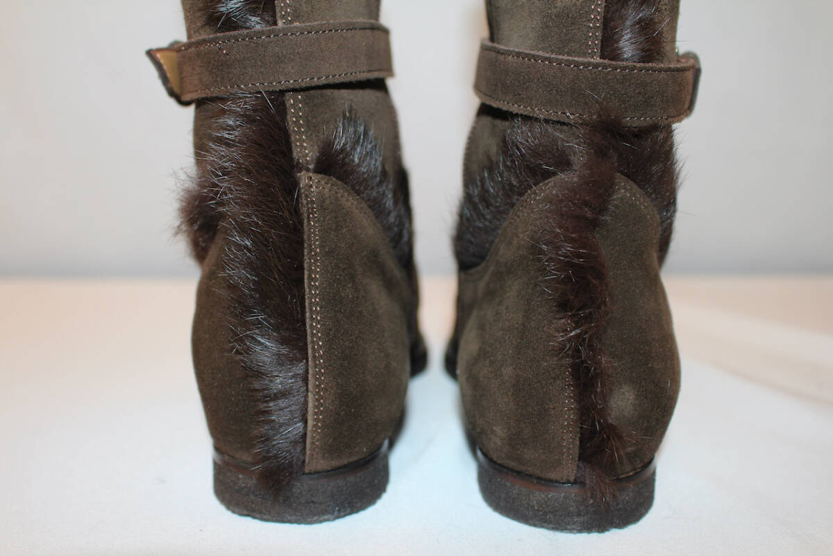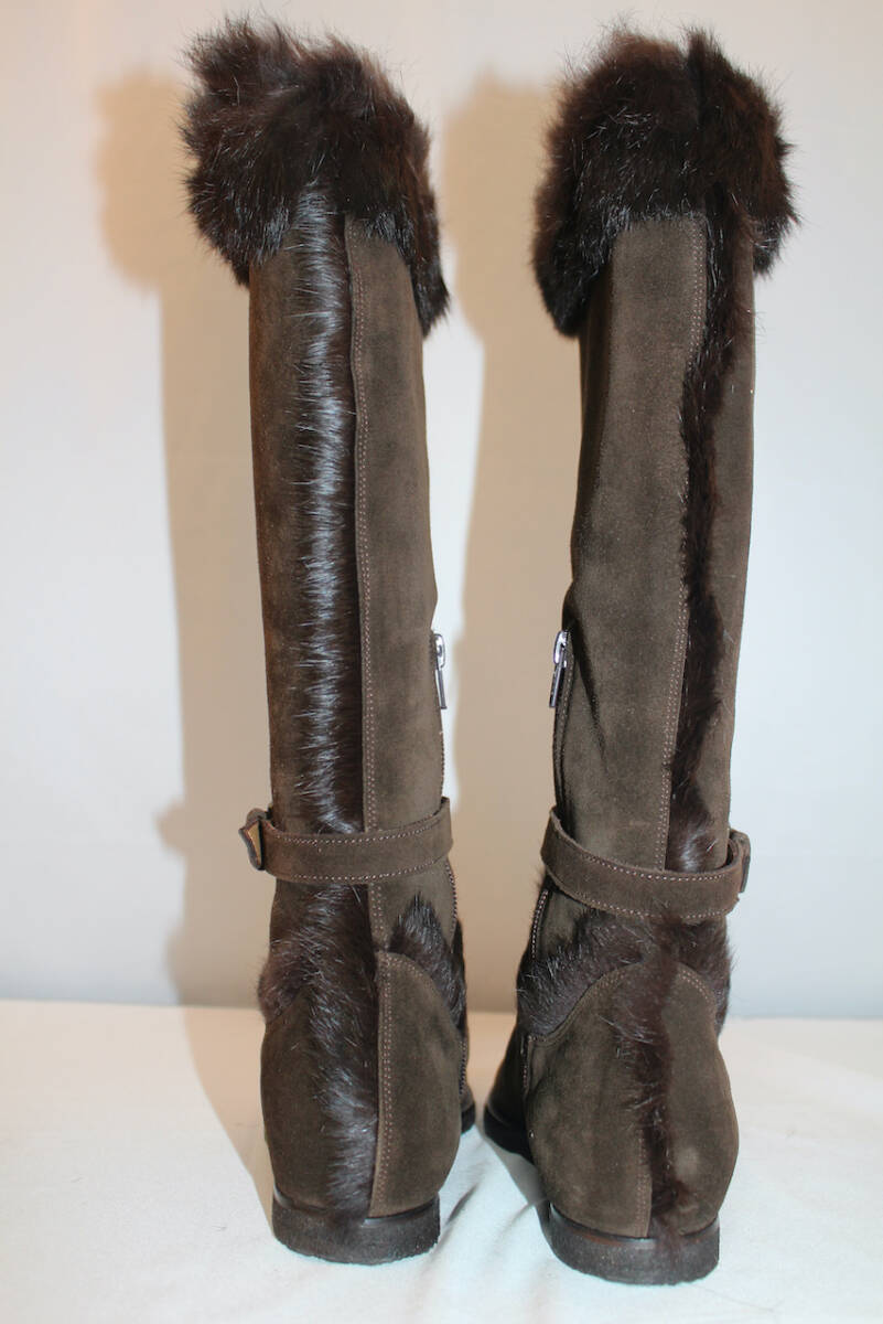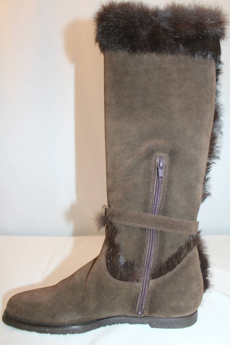 牛革、うさぎ毛皮、ブラウンカラー、ブーツの口幅17.5cm、ヒールの高さ2cm、ブーツの高さ40cm、定価118.650円、新品です。