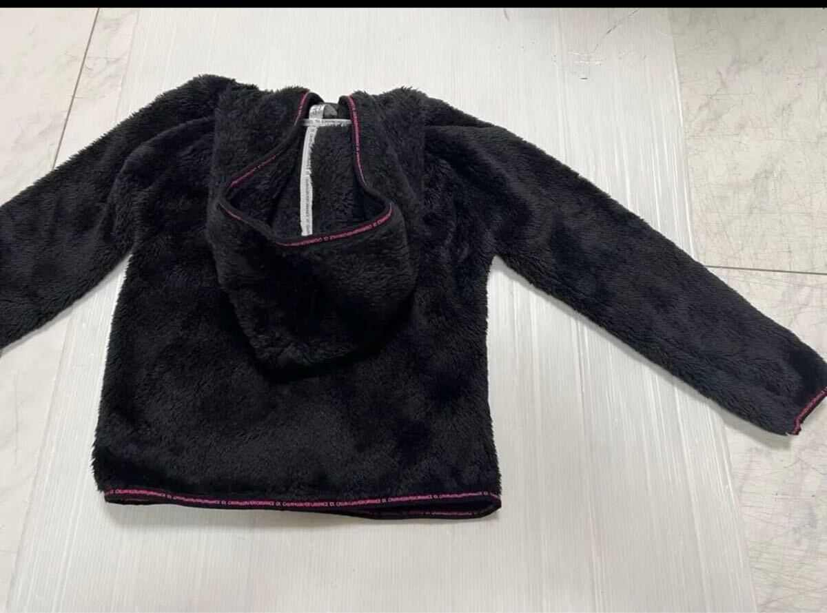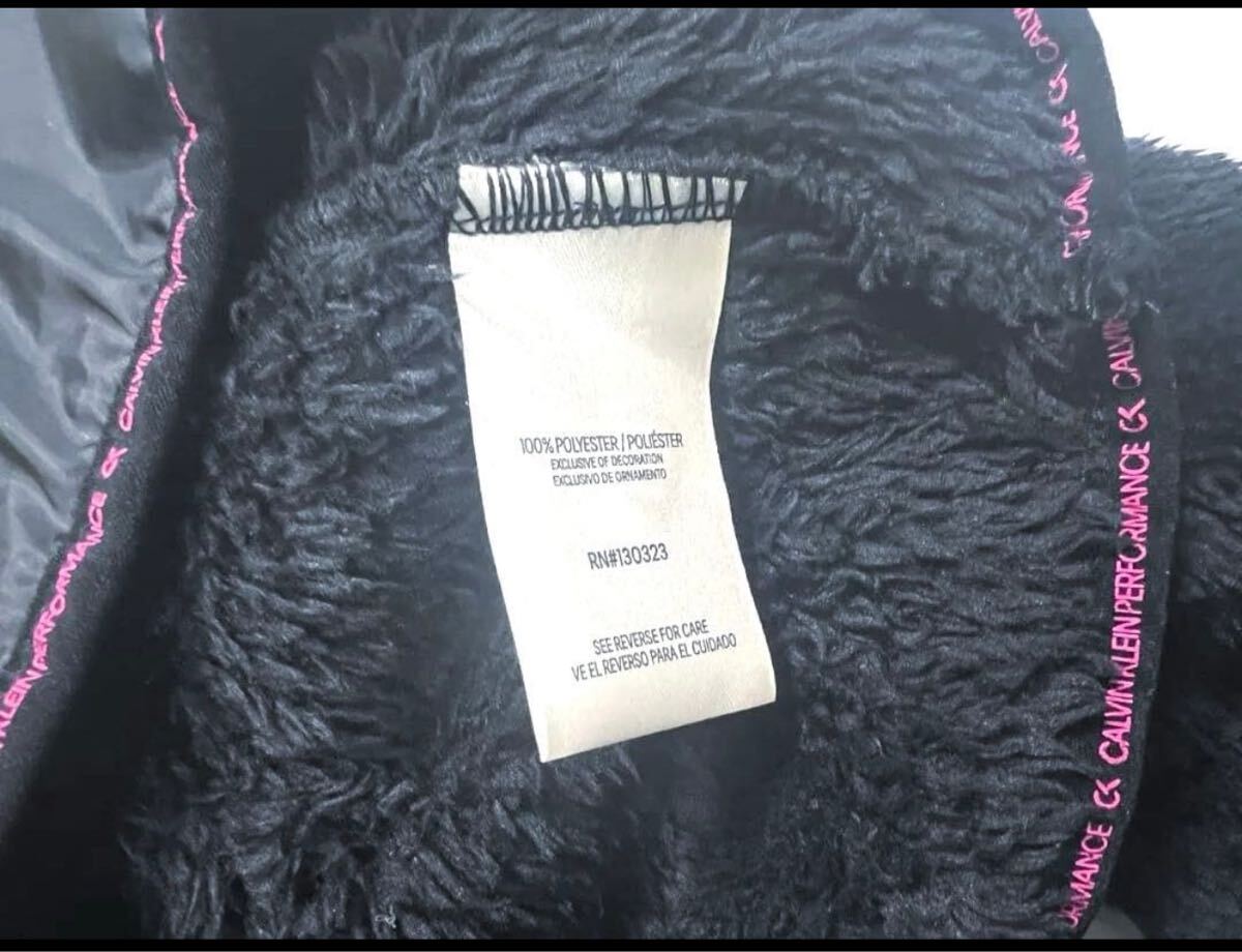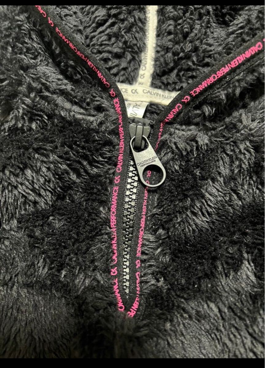 ブラックの長毛フリース地に、ショッキングピンクの総ロゴ ゴムテープ、とてもおしゃれなフーディです!