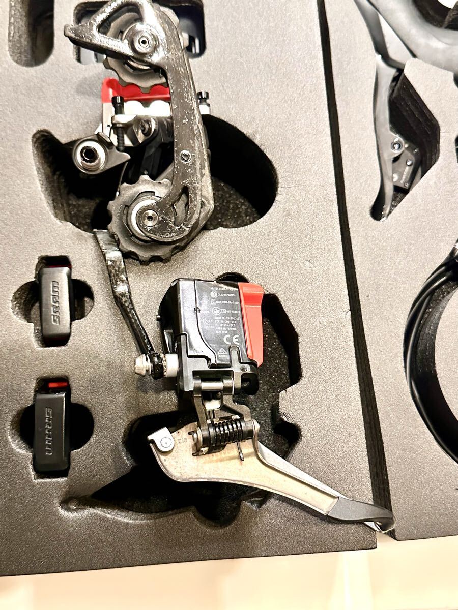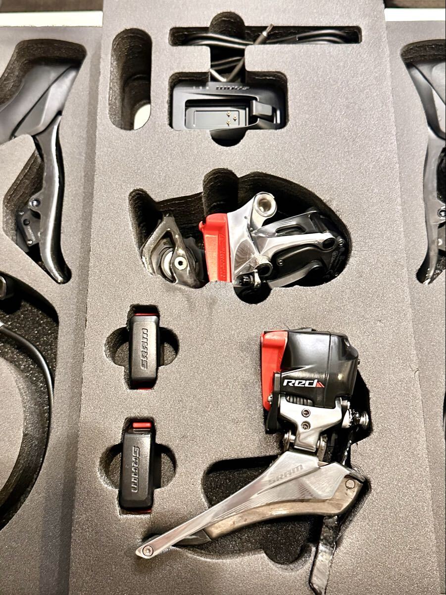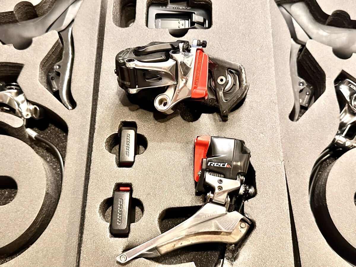 ご覧いただきありがとうございます。SRAM RED eTap HRD 22 2×11S 電動シフト 油圧ブレーキレバー&ブレーキキャリパー 前後ディレーラーセット を出品します。それなりに乗ったロードバイクから取り外したものです。取り外すまでは問題なく動いていました。バッテリーとチャージャーも付いています。ご質問にはお答えしますのでお取引終了後はノークレームノーリターンでお願い致します。