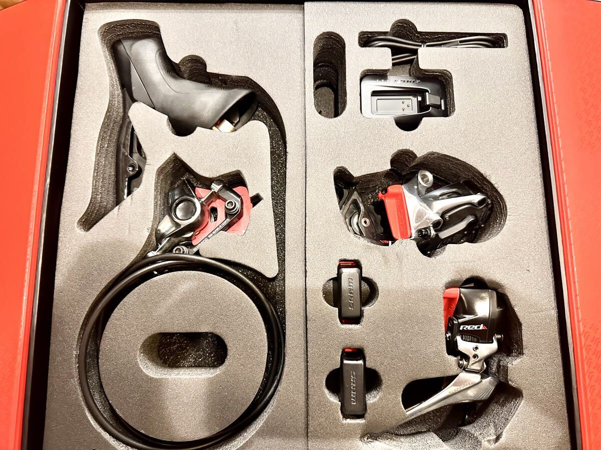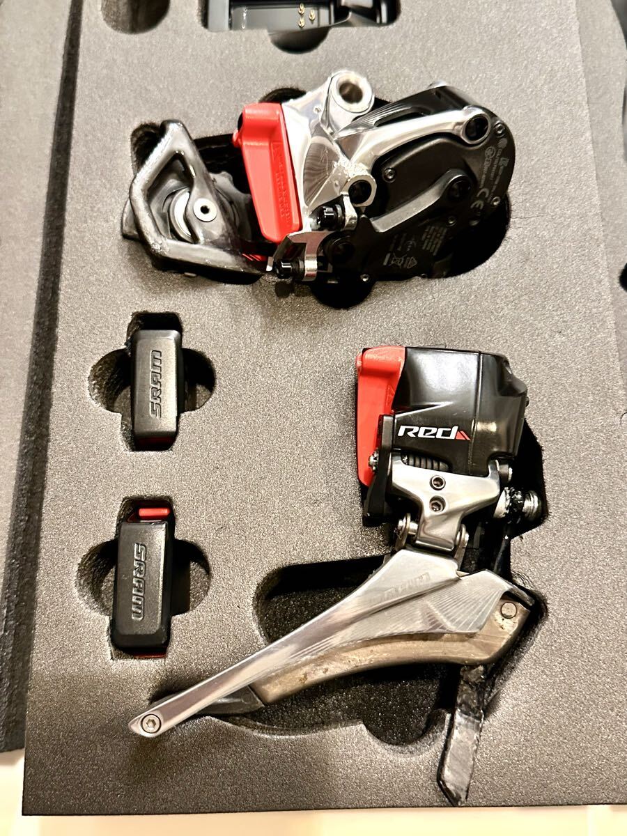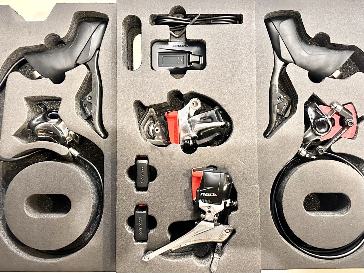 ご覧いただきありがとうございます。SRAM RED eTap HRD 22 2×11S 電動シフト 油圧ブレーキレバー&ブレーキキャリパー 前後ディレーラーセット を出品します。それなりに乗ったロードバイクから取り外したものです。取り外すまでは問題なく動いていました。バッテリーとチャージャーも付いています。ご質問にはお答えしますのでお取引終了後はノークレームノーリターンでお願い致します。