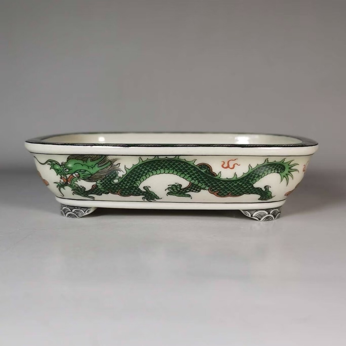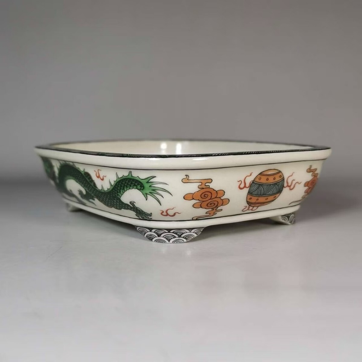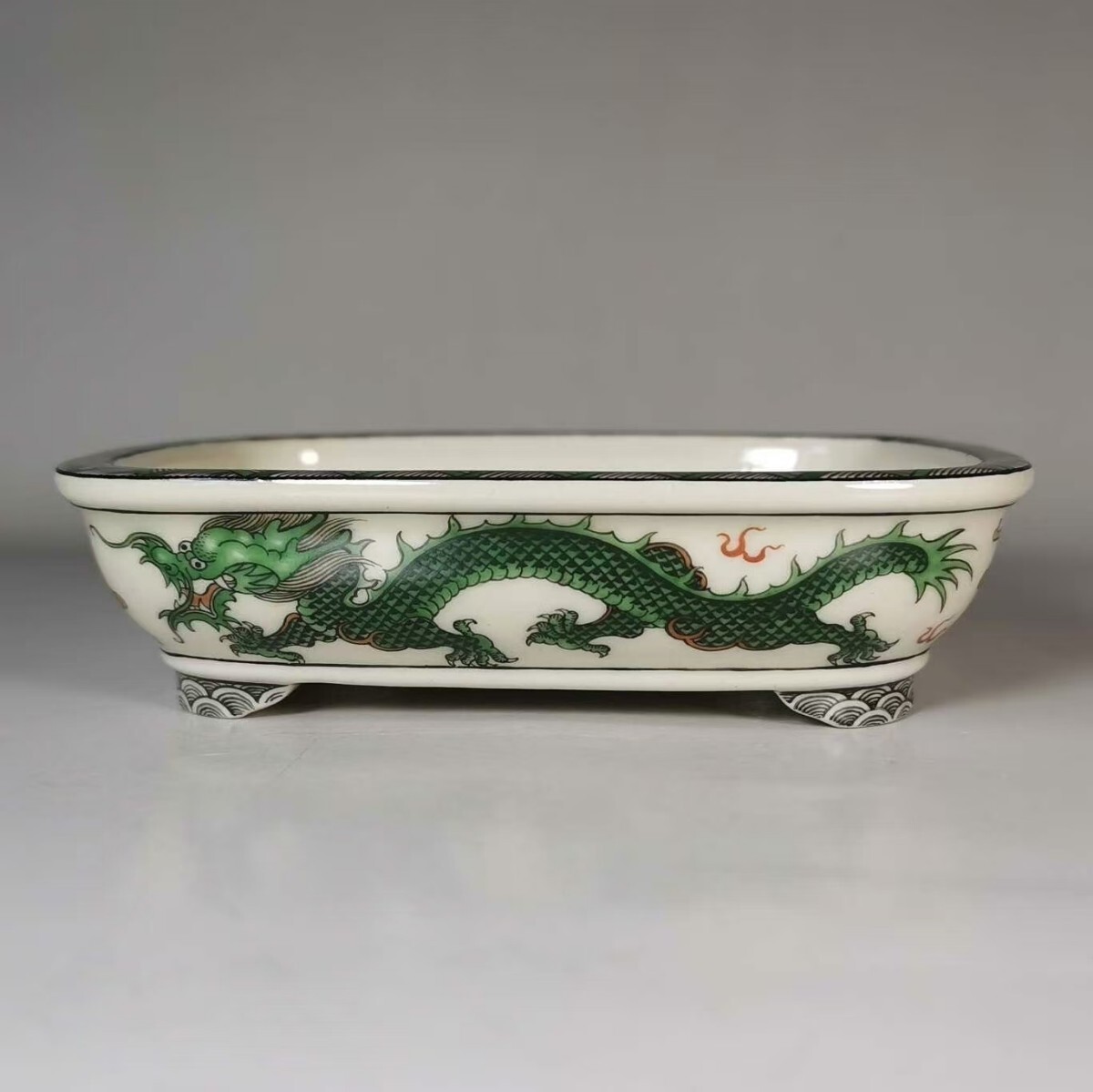 「墨彩龍図 × 外縁切立ち撫で角」の調和がもたらす荘厳な美しさ墨彩の重厚な彩りと青龍の象徴的な力強さ、外縁切立ち撫で角の洗練された造形美が融合し、「伝統工芸の奥深さ」と「視覚的な圧倒的なインパクト」を両立させています。光が当たると釉薬の艶と墨彩の深みが絡み合い,図柄の立体感と長方鉢の高級感が一層引き立ちます。