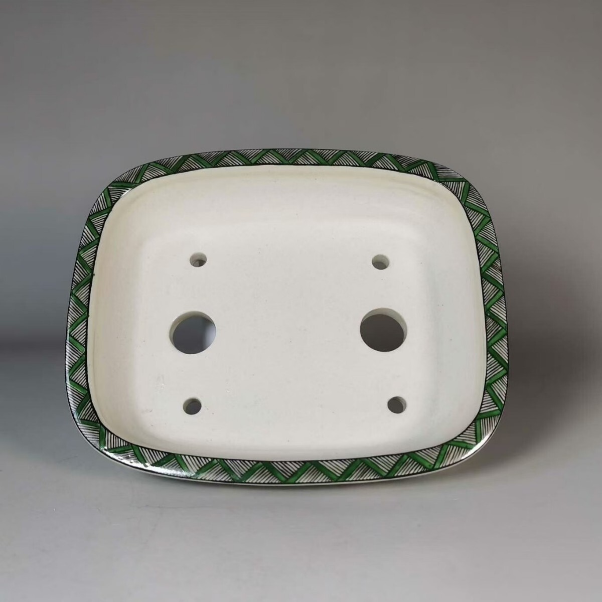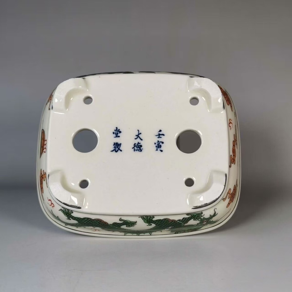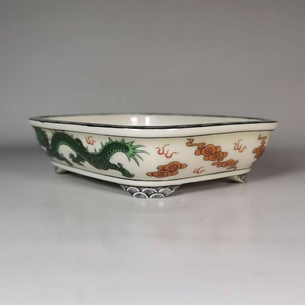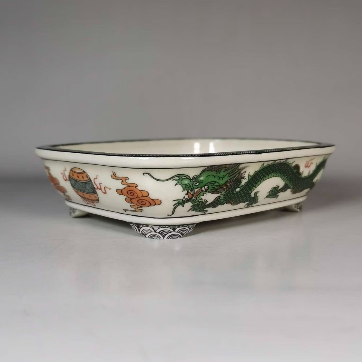 「墨彩龍図 × 外縁切立ち撫で角」の調和がもたらす荘厳な美しさ墨彩の重厚な彩りと青龍の象徴的な力強さ、外縁切立ち撫で角の洗練された造形美が融合し、「伝統工芸の奥深さ」と「視覚的な圧倒的なインパクト」を両立させています。光が当たると釉薬の艶と墨彩の深みが絡み合い,図柄の立体感と長方鉢の高級感が一層引き立ちます。