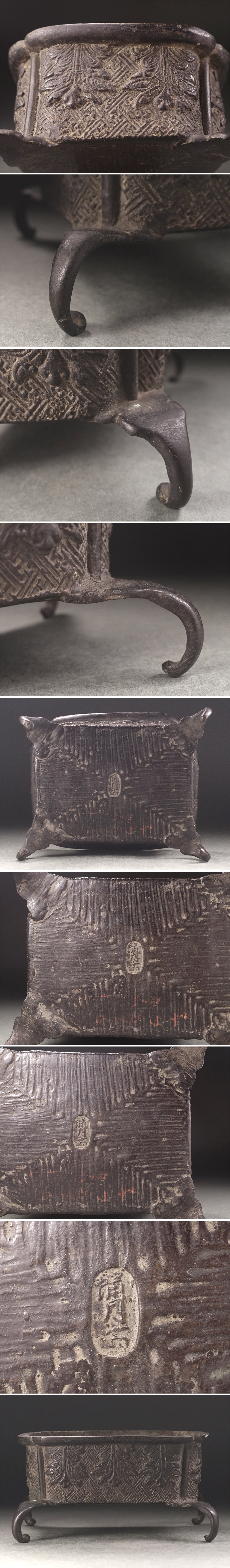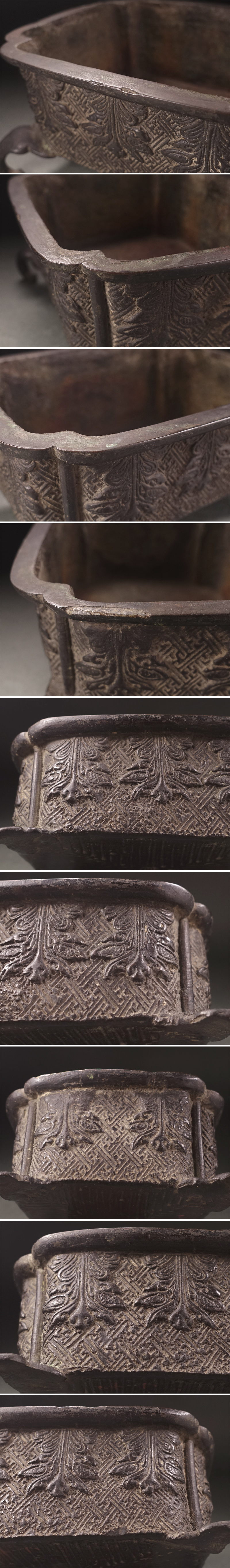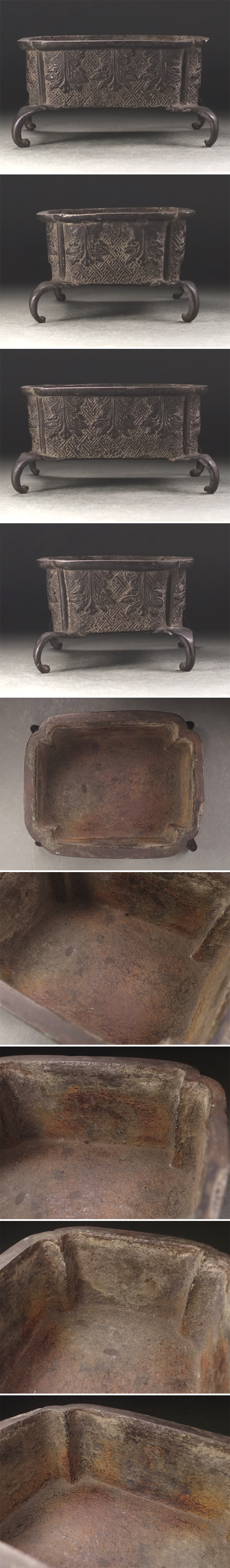 隅入の長方形に外縁、四足とした荘厳な砂鉢で、古格を備えた銅肌に草葉文様を繊細に意匠し、伝統の紗綾形を地紋として敷きつめています。