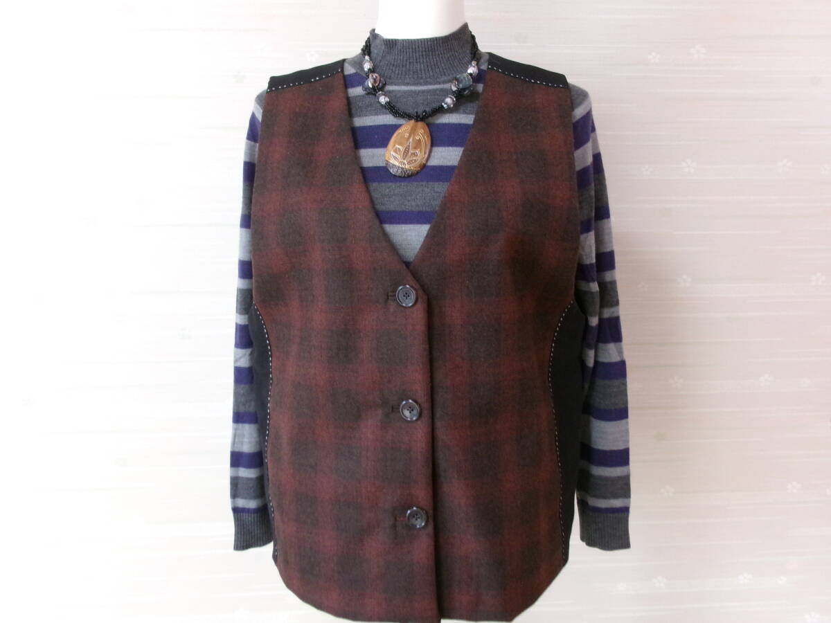 着物リメイク★裏付きのベスト★正絹・ウール地★Lサイズ★着丈57㎝★共布でボタンホール・見返し★着物の裏地を使用