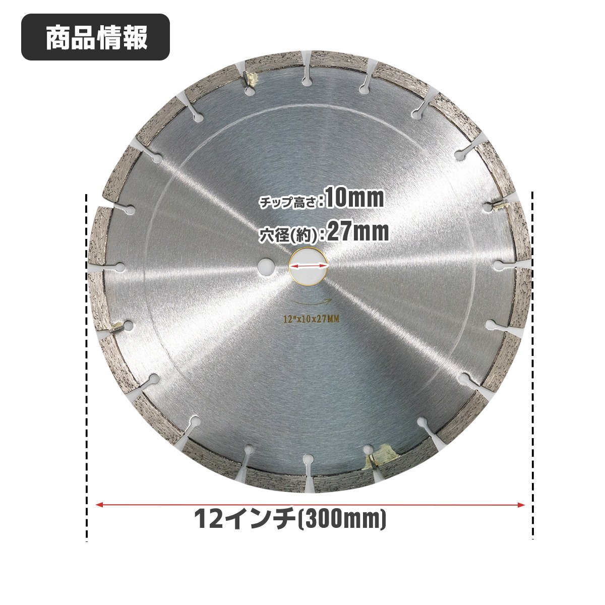 | 商品の詳細 | 新品未使用乾式湿式両対応 12インチダイヤモンドブレード決定版! アスファルト、コンクリート兼用 サイズ 300 X 10 X 27mm(25.4調整リング付) 数量:2枚入り | |