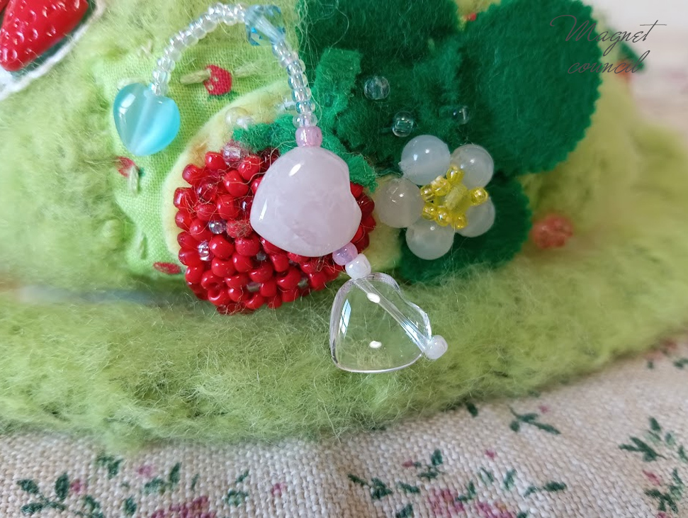 いちごポッケおうち:約7cm×11cm×5cm素材毛糸・天然石(インカローズ・ローズクォーツ・水晶)