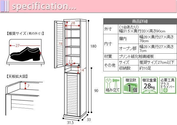 | 【カラー】 ダークブラウン、ナチュラル 【サイズ】 <外寸> 1台あたり:幅31.5×奥行33.0×高さ90.0cm <内寸> 扉内:幅28×奥行27×高さ78cm オープン部:幅28×奥行27×高さ7cm 【材質】 本体:プリント紙化粧繊維板 【収納数】 (約)10足 【生産国】 インドネシア 【梱包】 サイズ:97×35.5×27cm、重量:28kg 【その他】 推奨サイズ27cm以下 【組み立て品】 お客様による組み立てが必要です。 |