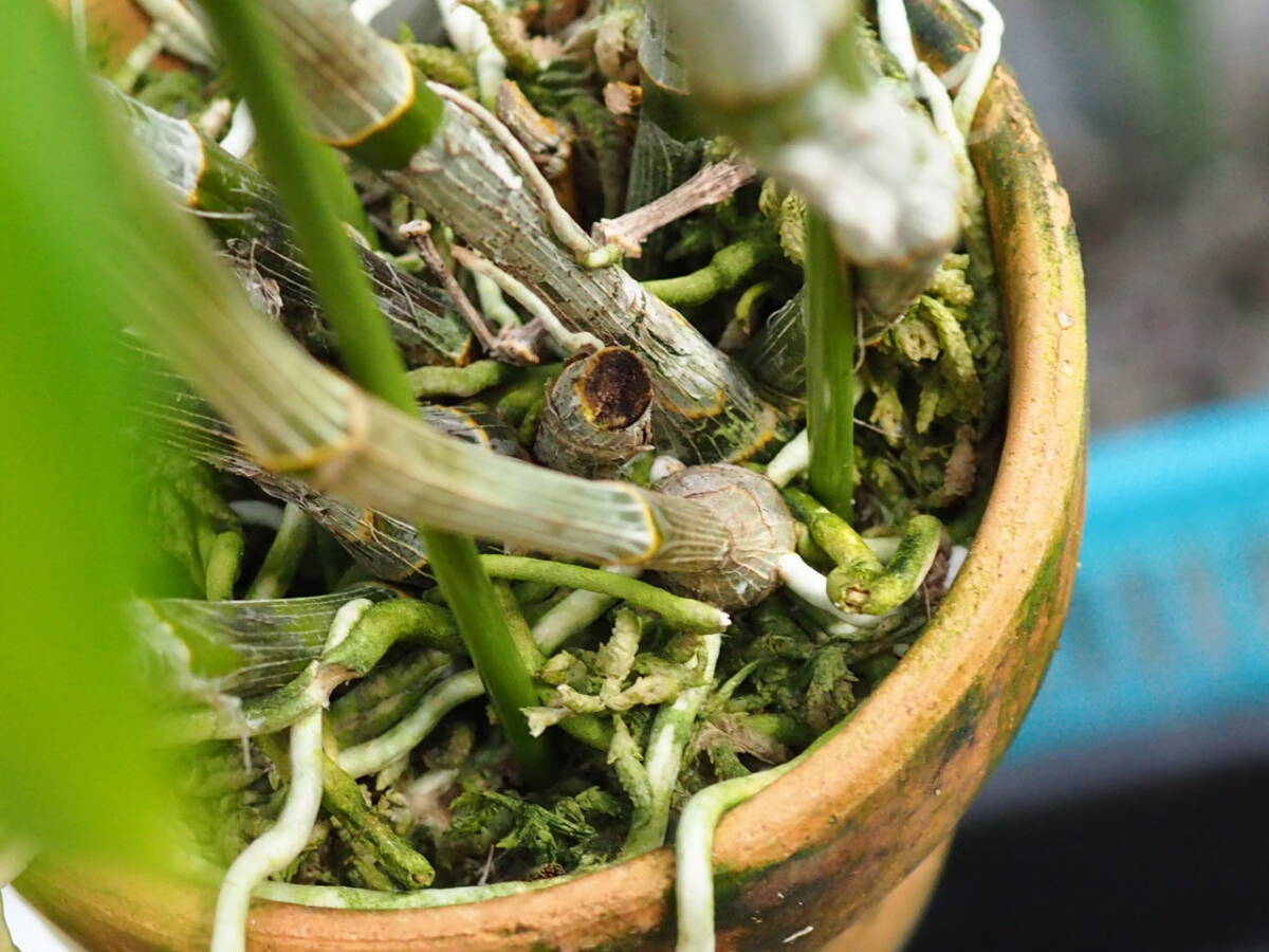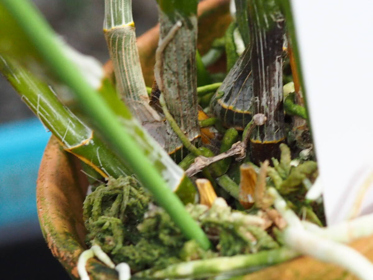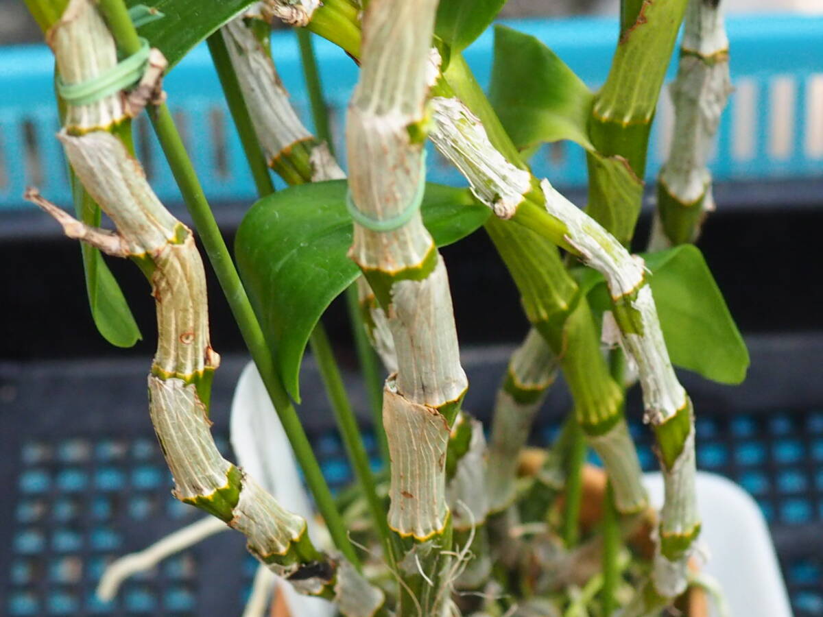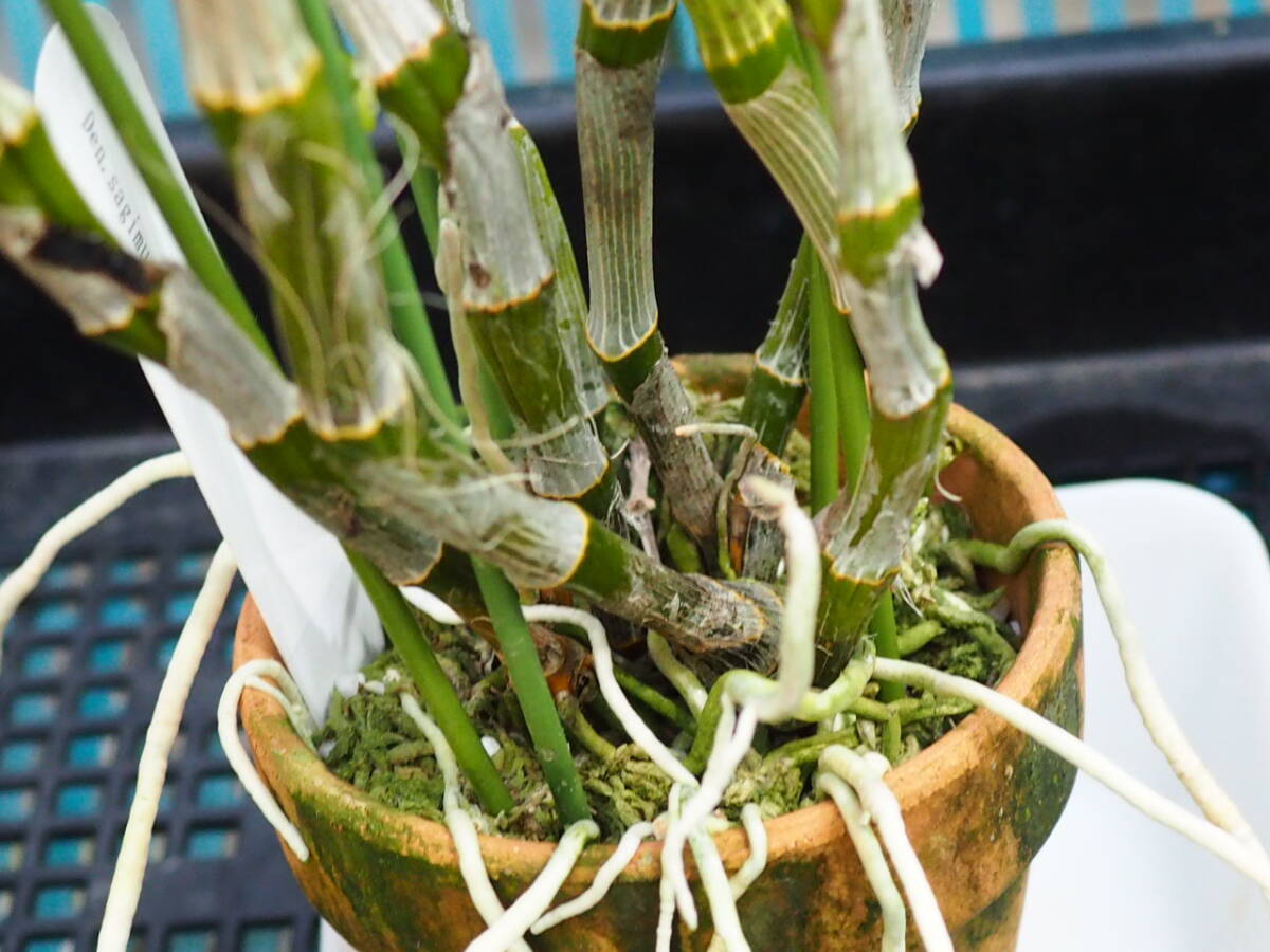 アルバ個体名が付いた‘sagimusume’より花弁が広い良い個体です。枯れたバルブはカットし高芽は外しました。低温処理中ですので暫くは低温の外栽培でお願いします。熊本以南は年中外栽培が可能です。