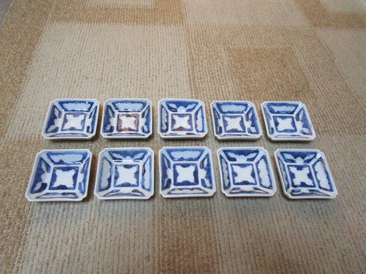 古伊万里 染付 陽刻 花模様 皿 小皿 角皿10枚 無傷 縦横約8.2cm高さ約2.4cm 追加画像有 ヤマト着払い発送