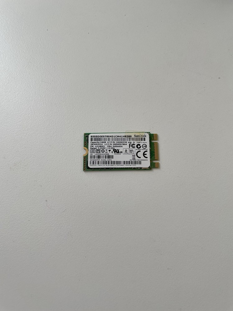 SanDisk SSD0E97864 M.2 SATA 2242サイズ 16GB SSDを出品いたします。SSD本体のみの出品となります。当方の記憶が正しければLenovo ThinkPad X240のHDDのキャッシュ用SSDだったと思われます。古いものなのでジャンク扱いでお願いいたします。いかなる場合もノーサポート、ノークレーム、ノーリターンでお願いいたします。発送方法は定形外郵送(送料140円)を予定しております。値下げ交渉は一切お断りさせていただきます。