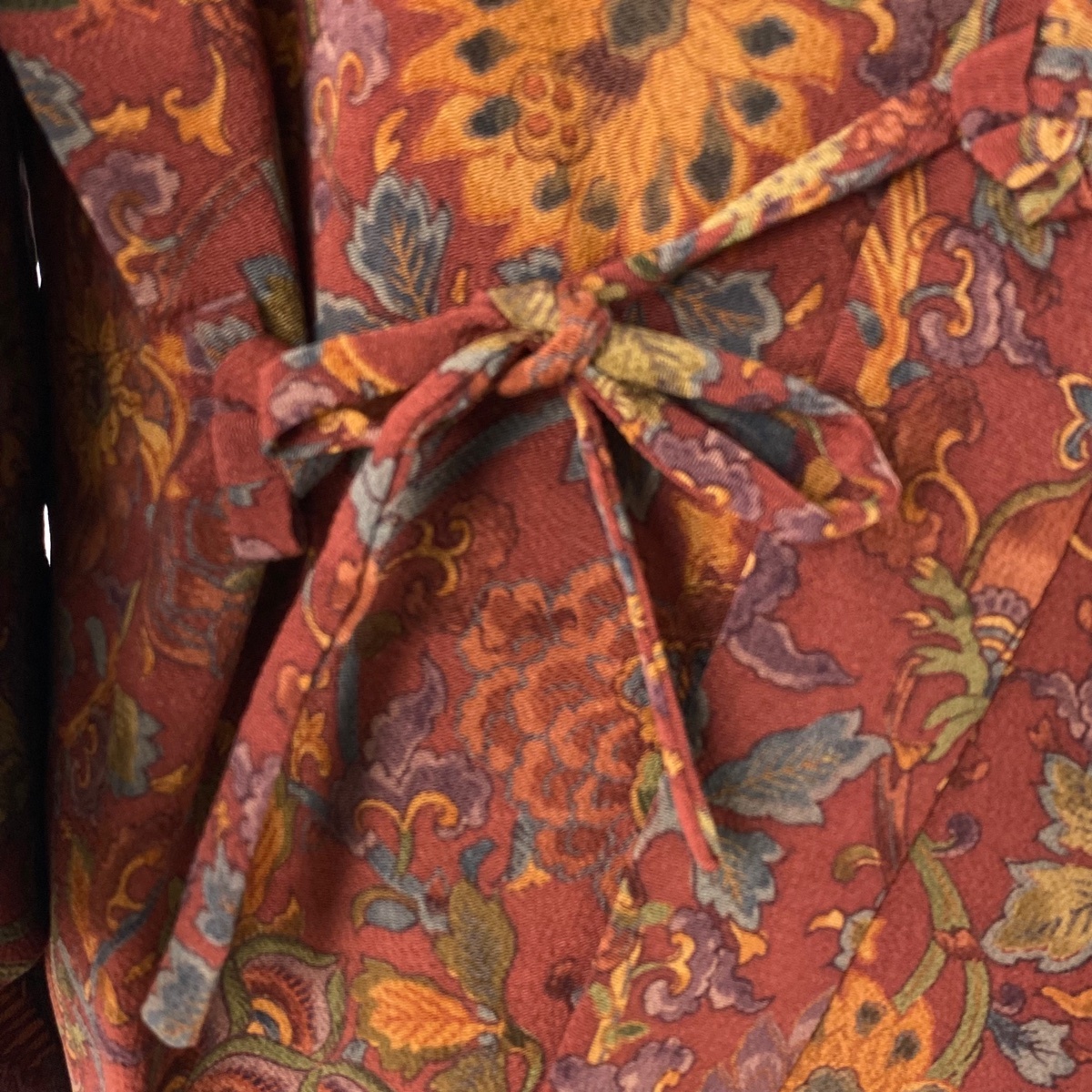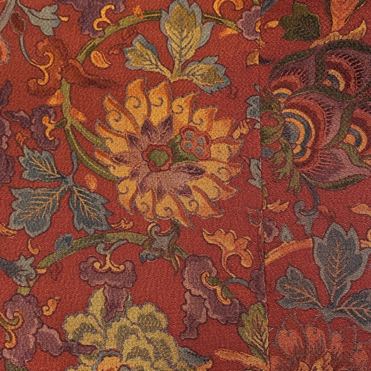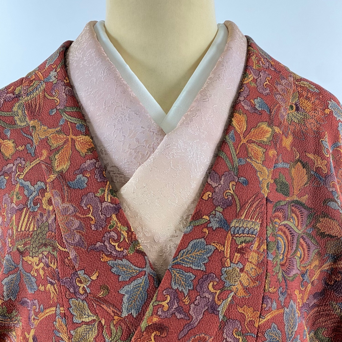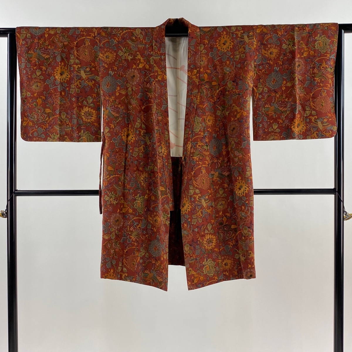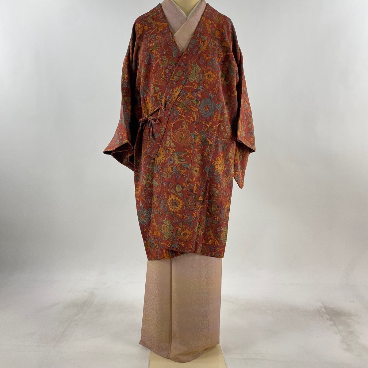 | 道中着 秀品 和装コート 着物衿 鳥 花唐草 縮緬 赤茶 身丈98 裄丈63.5 S 正絹 【中古】 |
