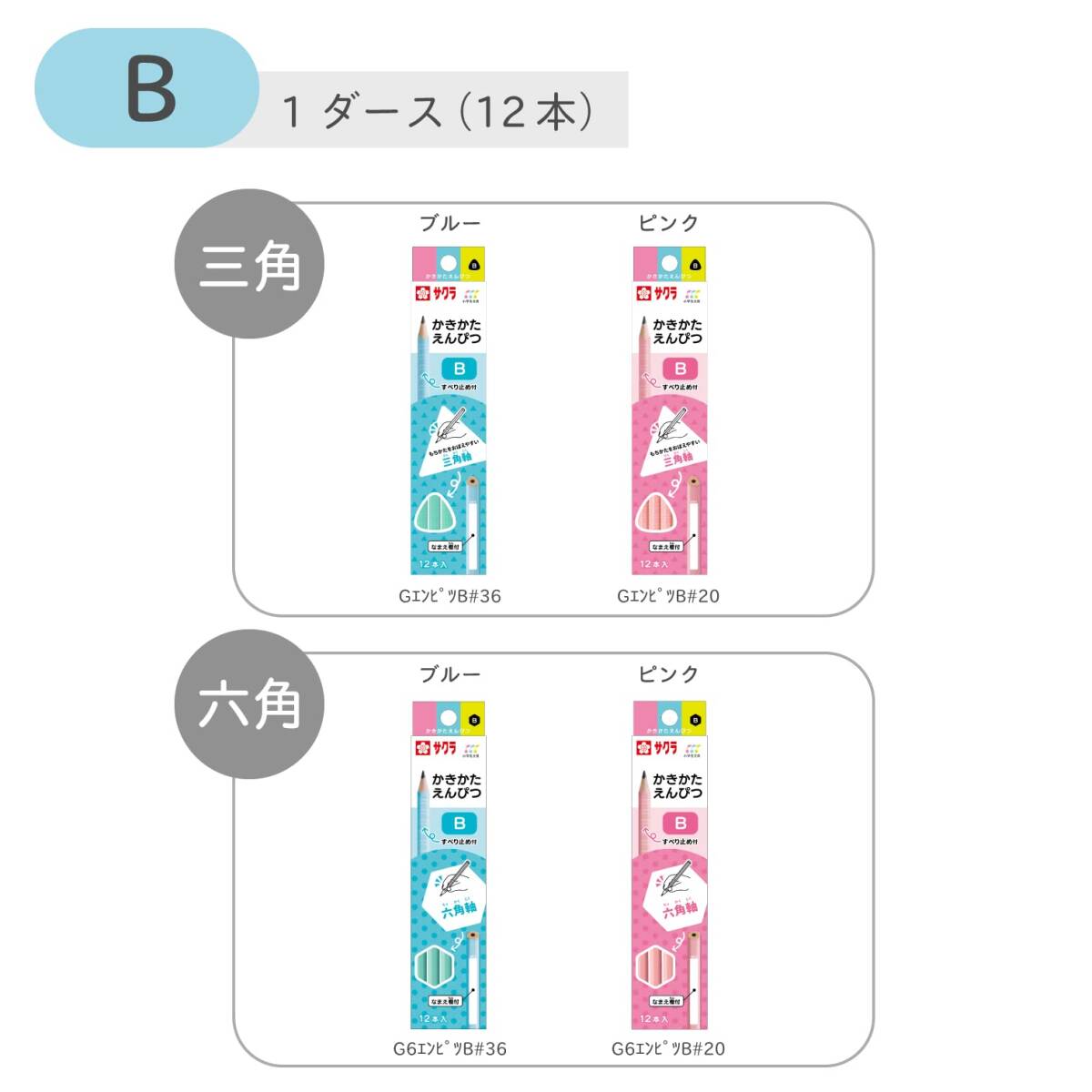 小学生の使いやすさを考慮し、学習のプロセスや体のサイズに合わせて開発された「小学生文具」シリーズ。 新入学や新学期におすすめのかきかた鉛筆12本入り。安心の日本製。 三角軸はえんぴつの正しい持ち方が自然と身につく。 六角軸は机から転がりにくい。 高い筆圧や汗でもしっかり掴める滑り止め付き。 名前欄が広くて書きやすい。白色なのでおなまえがよく見える。