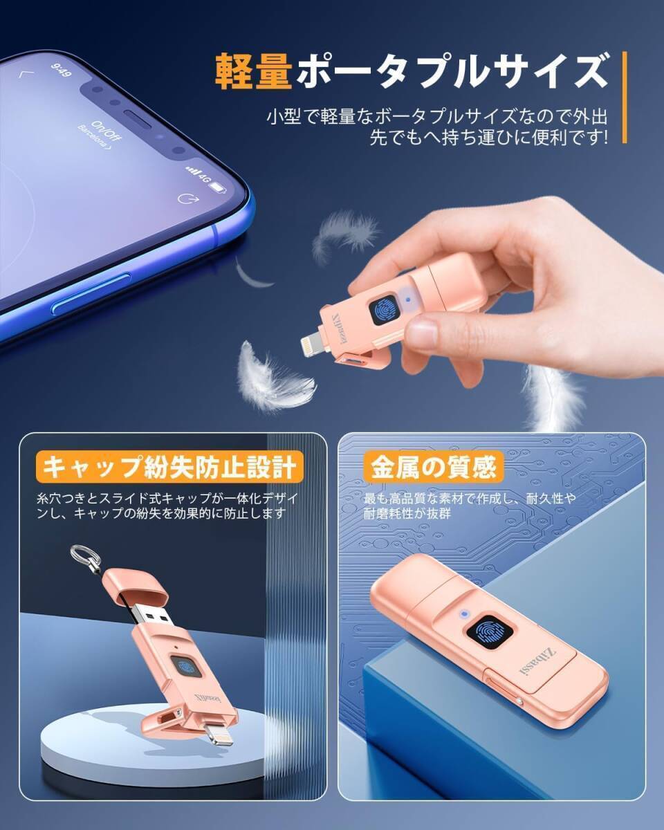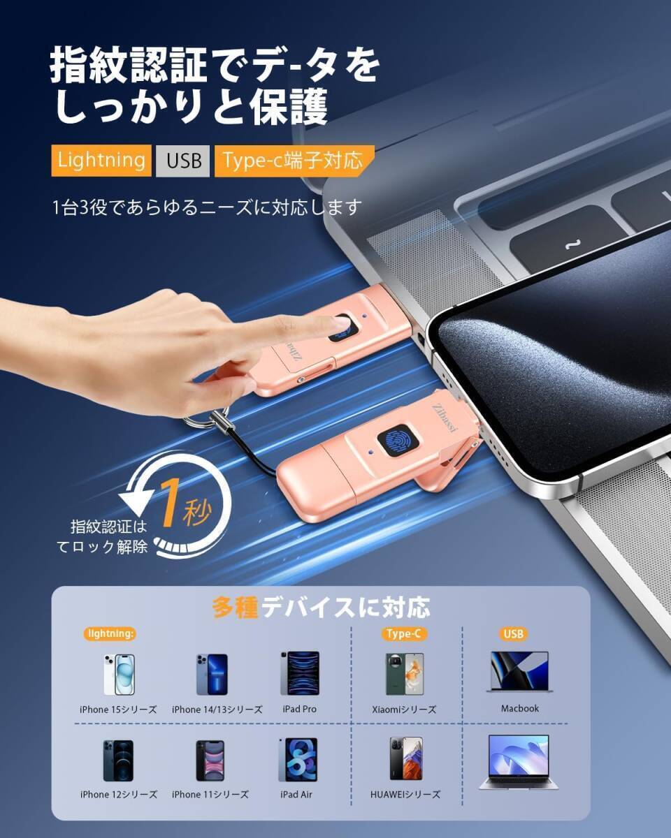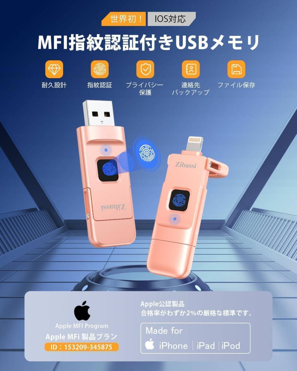 【MFi認証済み・指紋認証機能搭載】このmfi認証 Phone用USBメモリはアップルの厳格な基準をクリアし、PhoneやiPadとのシームレスな互換性を提供。データ転送やバックアップが、ますます安全かつ確実に。高度な生体認証技術を使用し、セキュリティを向上させ、指紋を使ってデータに簡単かつ安全にアクセスできます。データ紛失や盗難にも大切なデータの漏洩を防ぎます。【USB3.0高速転送・高速認識】指紋認証USBメモリはUSB3.0に対応しているため、高速で安定した書き込み読み込みスピードを実現。指紋認証はたったの1秒でロックを解除します。あらかじめ指紋、パスワードを登録しておくことで 本体中央をタッチするだけでロックを解除します。 360°あらゆる角度からでもスムーズに認証可能です。ネット環境がなくても気になる大量に溜まっている写真や動画データを簡単にバックアップできるので、端末の容量不足も解消できます!【多機種対応・絶対的な信頼感】Apple MFi認定のPhone 用USBメモリは、すべてのPhoneおよびiPadシリーズと互換性があります。USB-Cコネクタを搭載したiPad ProおよびMacbook、Androidとも互換性があります。phone外付けusb はPhone 15 Pro Max/15 Pro/15 Plus/15/Phone 14 Pro Max/14 Pro/14 Plus/14/SE 3/13 Pro Max/13 Pro /13/13 mini /12 Pro Max/12 Pro/12 /SE 2 /11 Pro Max/11 Pro/11 /XR/XS Max/XS /X /8 Plus/8/i Pad Air(第1/2/3世代)/ MacBook(Pro/Air)/iPad mini(第1/2/3/4/5世代)/i Pad(第5/6/7/8/9世代などにサポートします 。【多機能ファイル管理・iCloud課金対策】Phone対応バックアップは豊富な機能で様々なデータを効率的に管理。ファイルの整理やデータのバックアップ、移行など、多岐にわたるニーズに応え、デジタルライフをさらに豊かにします。デバイス上でデータを管理し、コストを削減するための絶好の選択肢です。iCloud関連の追加費用を回避し、経済的かつ安全にデータを管理できます。【洗練されたデザイン・安心のサービス】手に馴染む形状と高品質な素材が、使い心地とスタイルを兼ね備えています。端子部分をホコリや傷から守ってくれるダストキャップが端子それぞれに付属しています。紛失を有効に防ぐために付属の紐でキーチェーンに取り付けることができます。