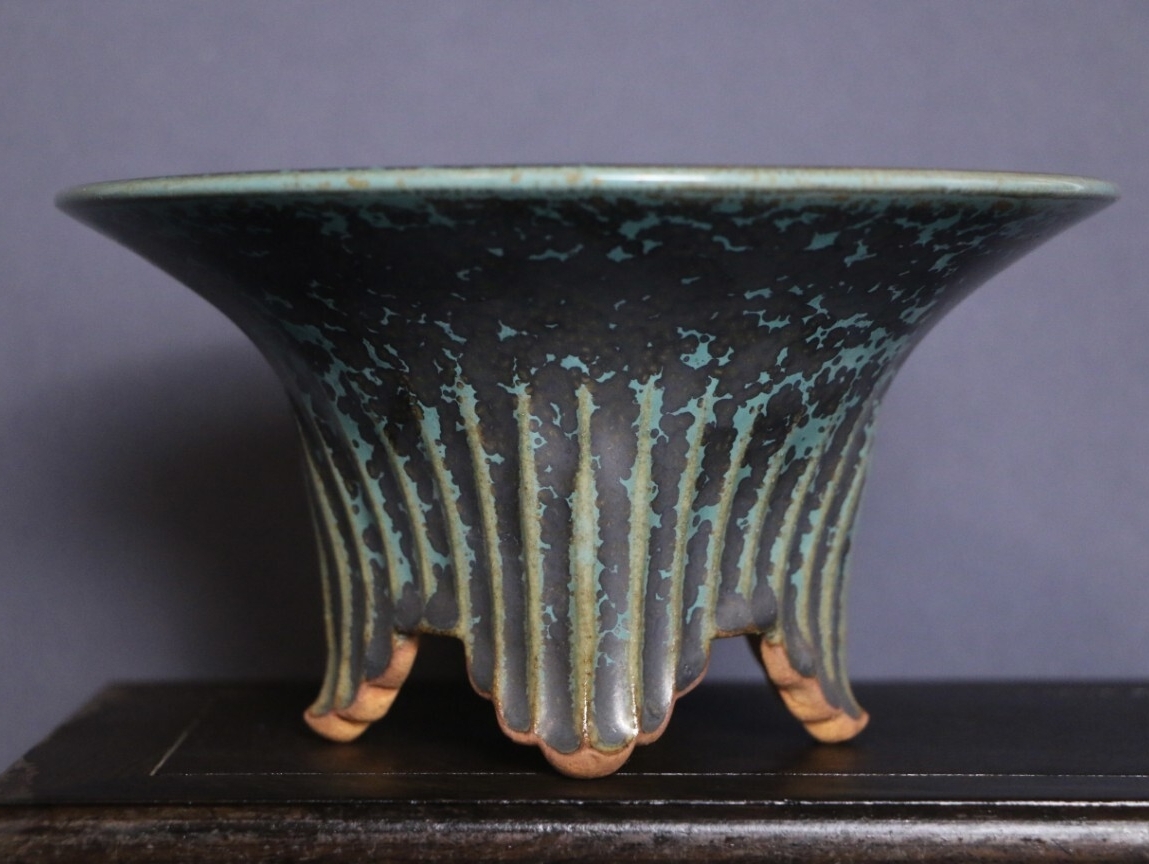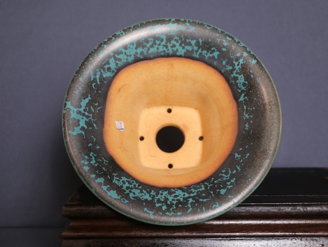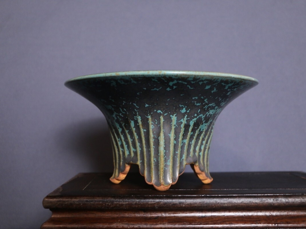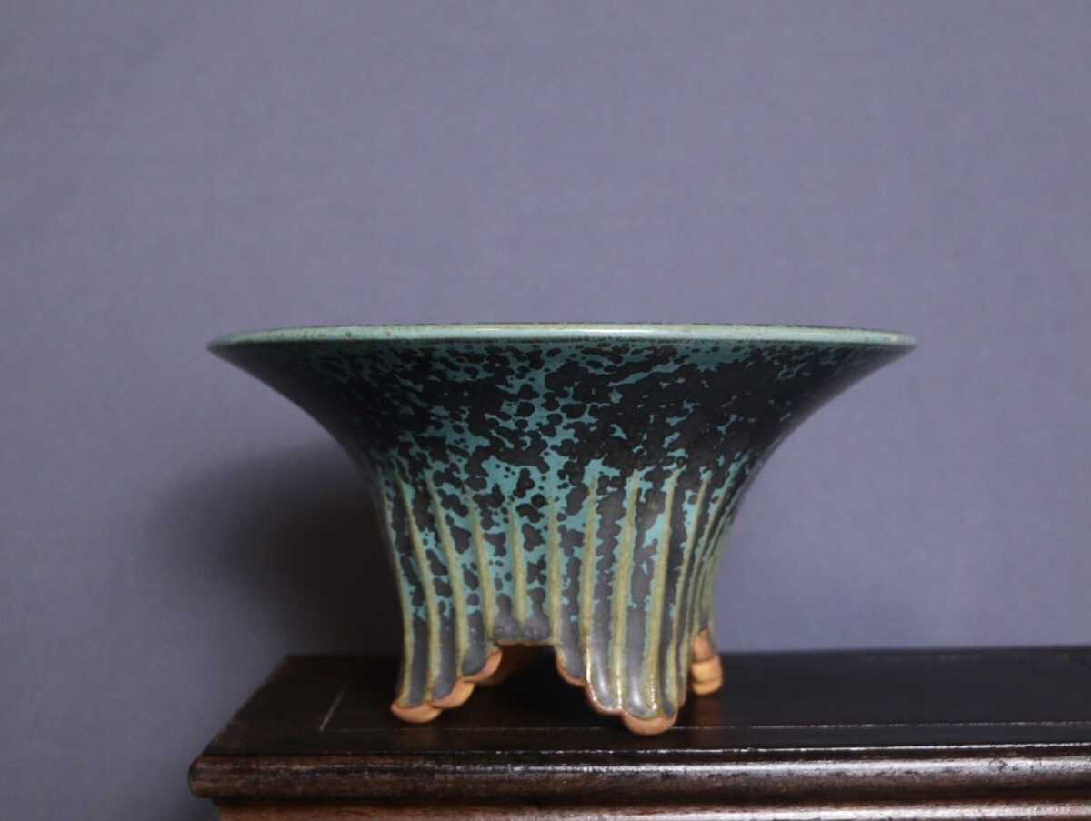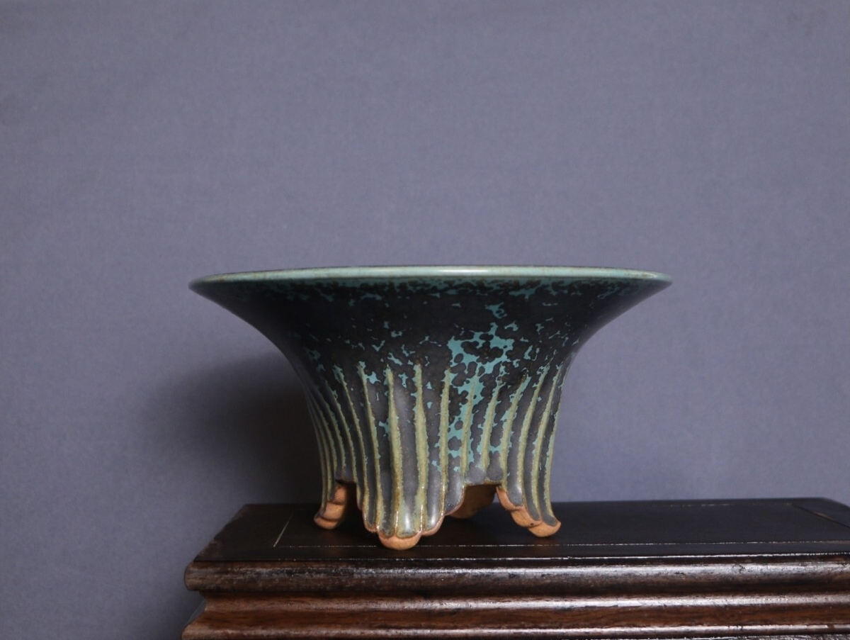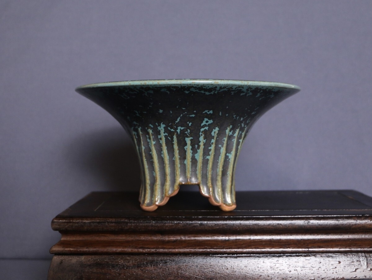 人気作家源山暉による全手工製作の逸品です。器身に纏わる青黒釉が高温焼成で「夜空の星屑が濃霧に紛れるよう」独特な斑点紋を紡ぎ出し、特徴的な外縁丸型造形は優雅な曲線と緻密な匠技が融合し、伝統の美と現代のアート感を同居させたデザインとなっています。外縁丸型のデザインは多肉や小型盆栽の育てに最適で、源山暉の手作りの温もりと窯変の繊細な星屑変化が、卓上に高級感のアート空間を作り出します。