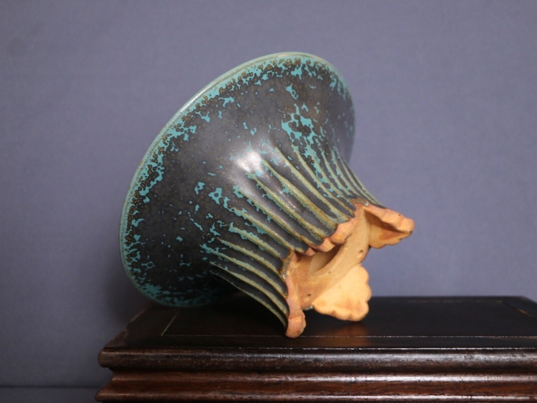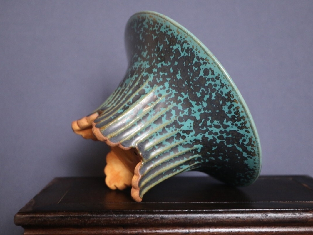 源山暉独自レシピの釉薬が高温窯で焼成され、青黒釉に星屑のような斑点がランダムに広がる唯一無二の表情を生み出し、光を当てると妖しく輝きます。外縁丸型の優雅な曲線と足部の独特造形は職人の手による丁寧な成形技術の賜物で、伝統的な丸鉢意象に新たな芸術的解釈を加えています。