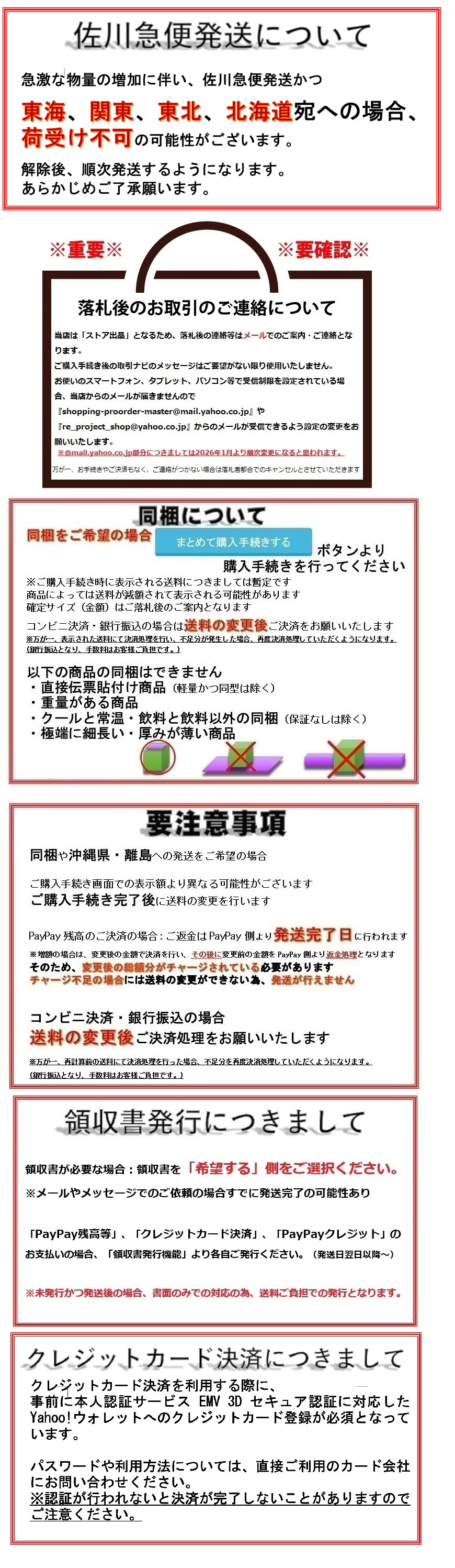 ※商品の発送は平日(月~金)となります。 基本的には土曜・日曜・祝祭日に発送業務は行なっておりませんので、ご注意ください。 ※日本郵便からの発送は平日の月・水・金曜日のみの発送です。 祝祭日の発送は行なっておりません。 また発送日が祝日にあたる場合は翌日の発送ではなく、次の平日の月・水・金曜日のいずれかです。 ※商品発送のタイミングについて 【『16:00時点でのご入金確認分』を翌日に発送 】となります。 ※週末のご入金、商品発送について 【『木曜の16:00』までのご入金→金曜日に発送】となります。(祝祭日を除く) 【『木曜の16:01~日曜の16:00』のご入金→月曜日に発送】となります。(祝祭日を除く) ※『当日発送』『翌日必着』等には対応できませんので予めご了承いただき、時間的に余裕を持ってのお取引をお願いいたします。 ※キャンセル期限を超過する商品保管はいたしておりません。 ※商品の発送が完了いたしましたら、『商品発送完了のご案内』メールをお送りさせていただきます。 そちらのメール内に『お問い合せ番号』『商品追跡サイトへのリンク』が記載されておりますので、配送状況等をご確認ください。 発送日はメールをお送りした日となります。 システムの都合上 まれに、佐川急便さんご提供システムのお日にちが、前日の日にちになっていることもございます。予めご了承ください。 ※おトク指定便の設定はございません。 遅めの指定も承れますが、遅めの指定をされましてもPayPayポイントの付与もございません。 定形外郵便の発送日は限られておりますが、ポイントの付与もございません。 ※佐川急便 指定場所配送サービスについて 当ストアは佐川急便と指定場所配送サービスの契約を行っていないため、ご利用できません。 ご要望欄にご記入いただきましても対応いたしかねます。 ※佐川急便 置き配サービスについて ご利用可能(対象外商品を除く)ですので、ご落札者様ご自身でお手続きをお願いいたします。 要望欄やお届け先等に記載されましても当ストアでは対応いたしかねます。 | |