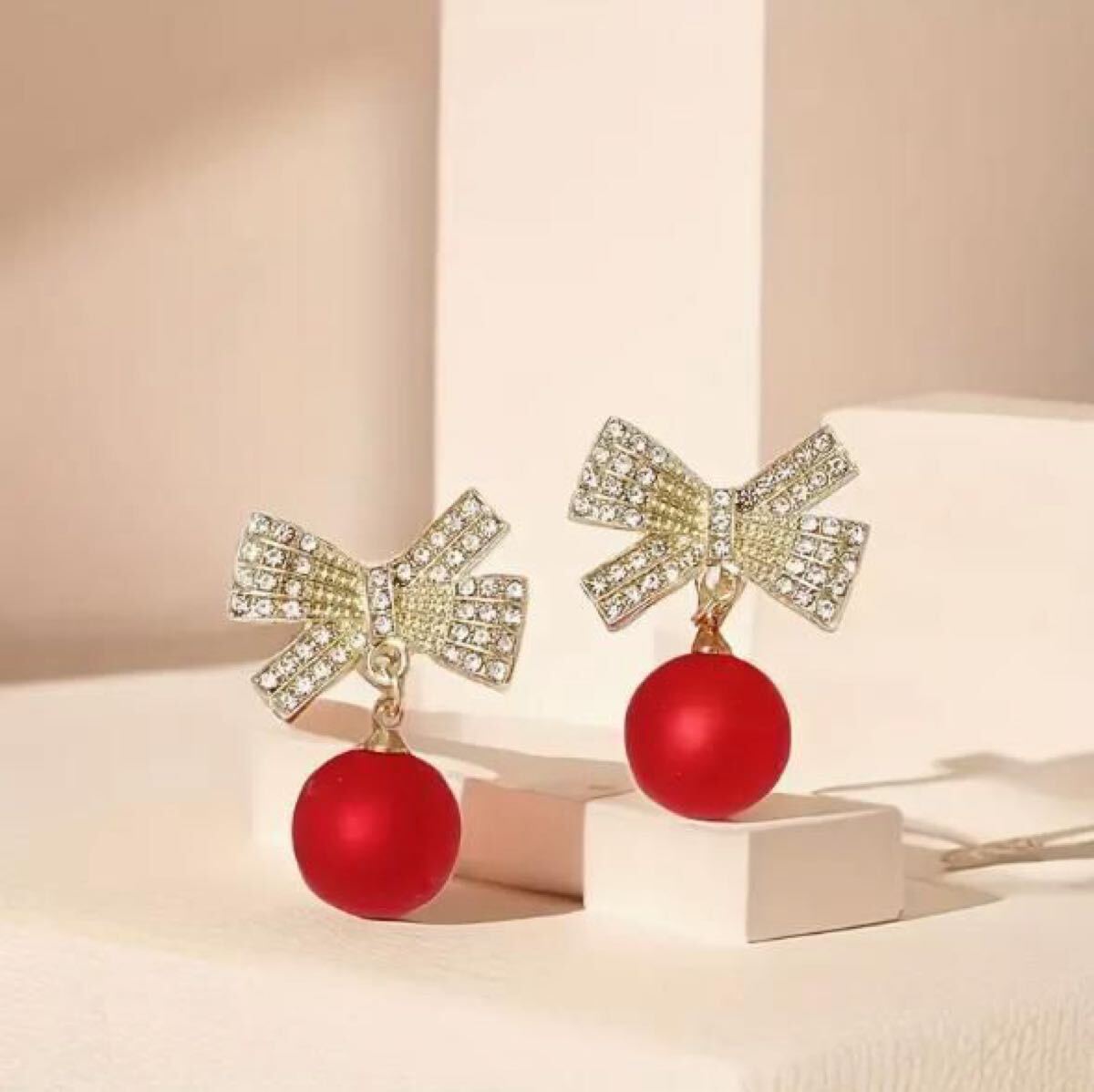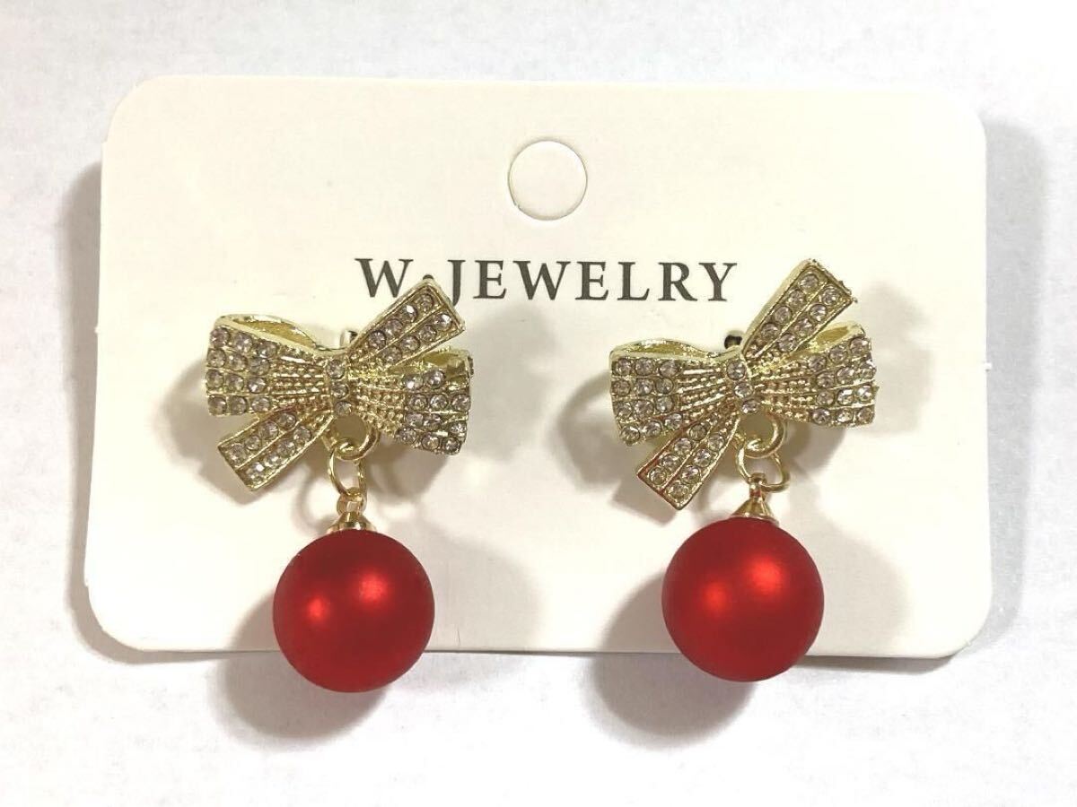 高級感のあるオシャレなリボンとレッドパールのピアスです。
