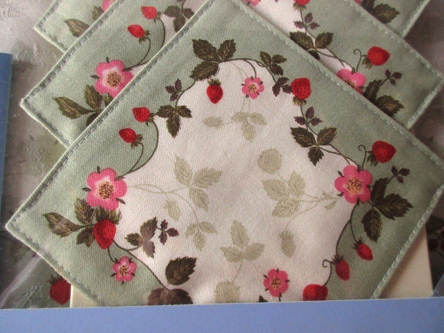 ワイルドストロベリー/グリーンのおしゃれなティーマット&コースター・セットです。