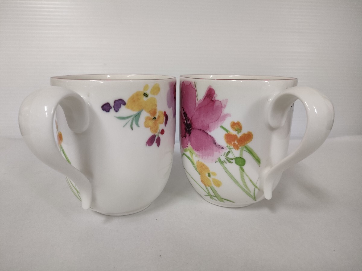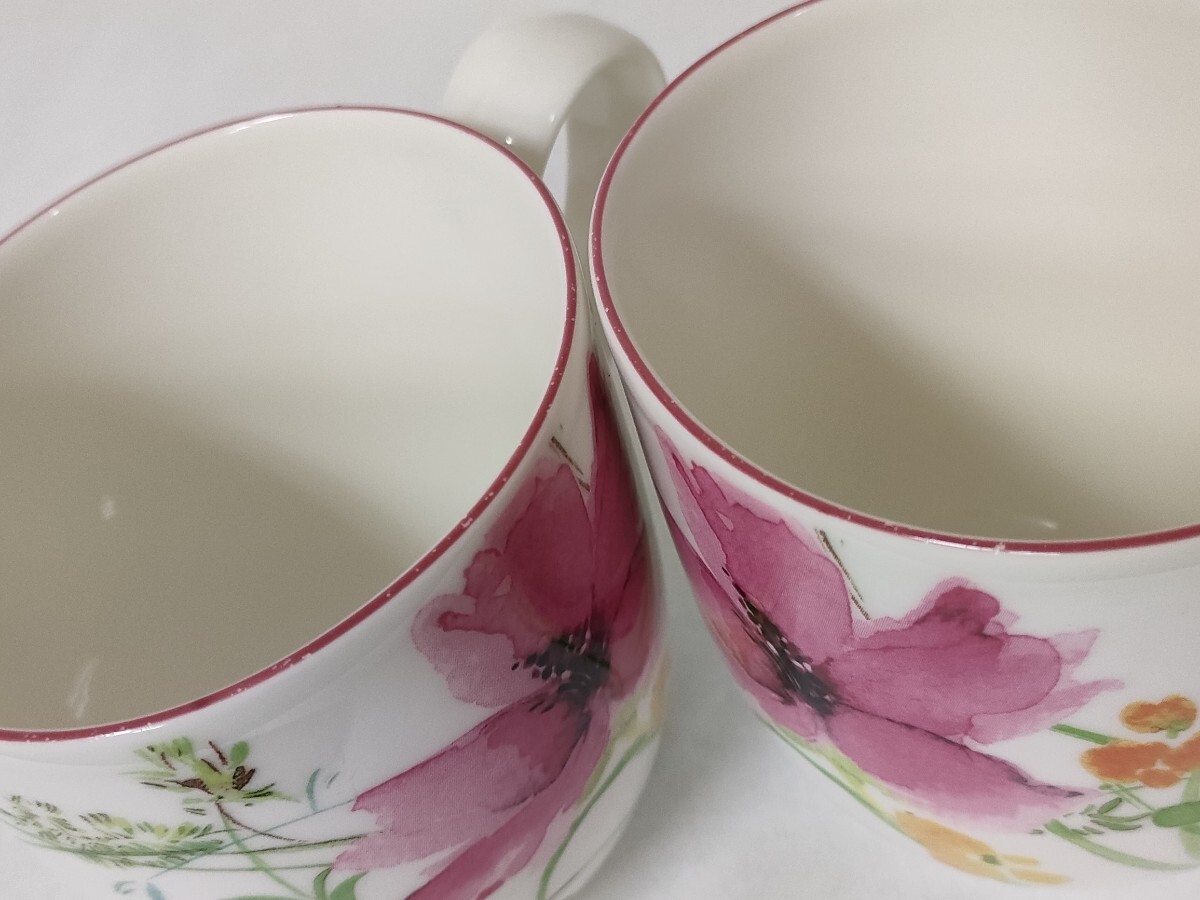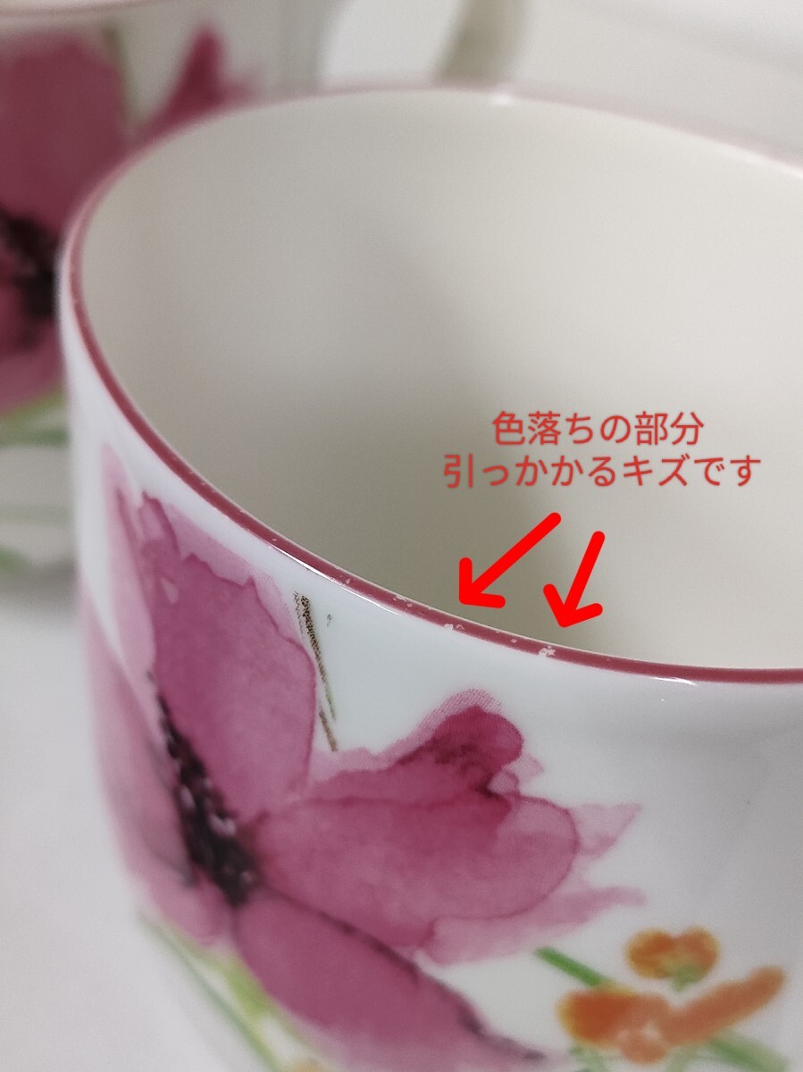 マグカップ縁のピンク色が色落ちや薄くなっている部分、撫でると引っかかるキズがあります