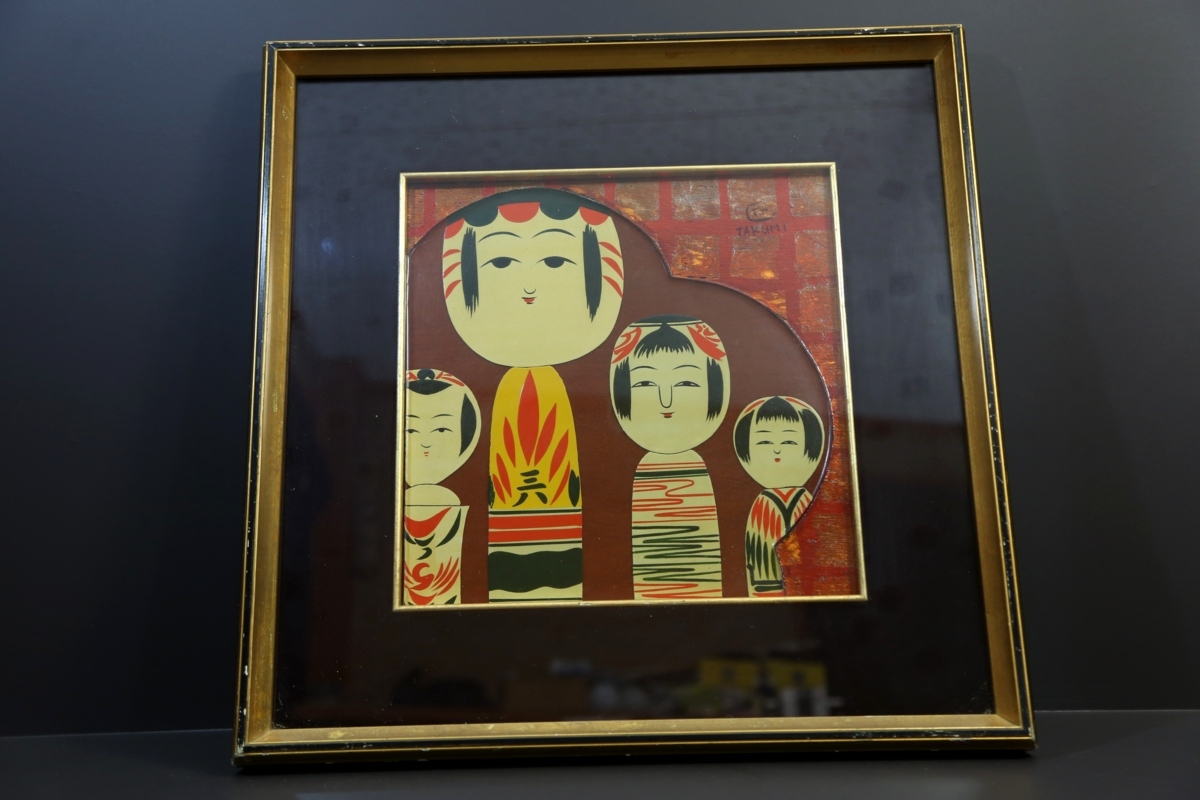 可愛いこけしの額装です。経年ありますが状態良好です。縦・横48.5cm。ノークレーム、ノーリターンでお願い致します。この他にも出品しておりますのでご覧下さい。ここをクリック